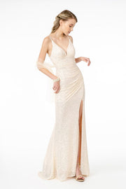 Illusion Deep V-Neck Ruched Sequin Bodycon Dress w/ Slit