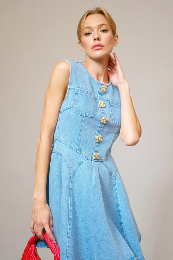 Jeweled Button Denim Flare Dress
