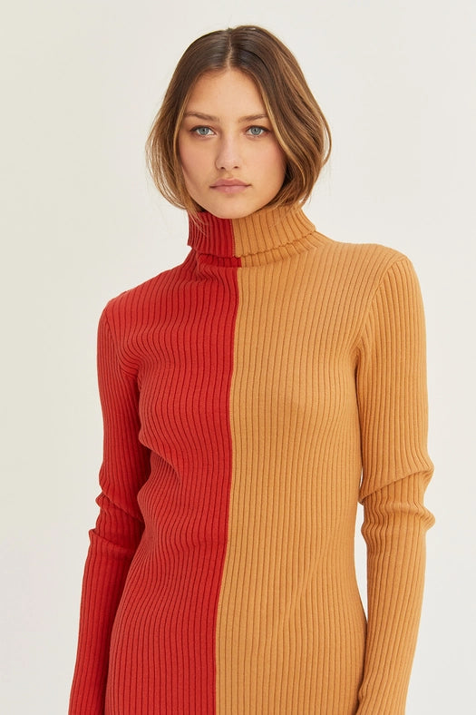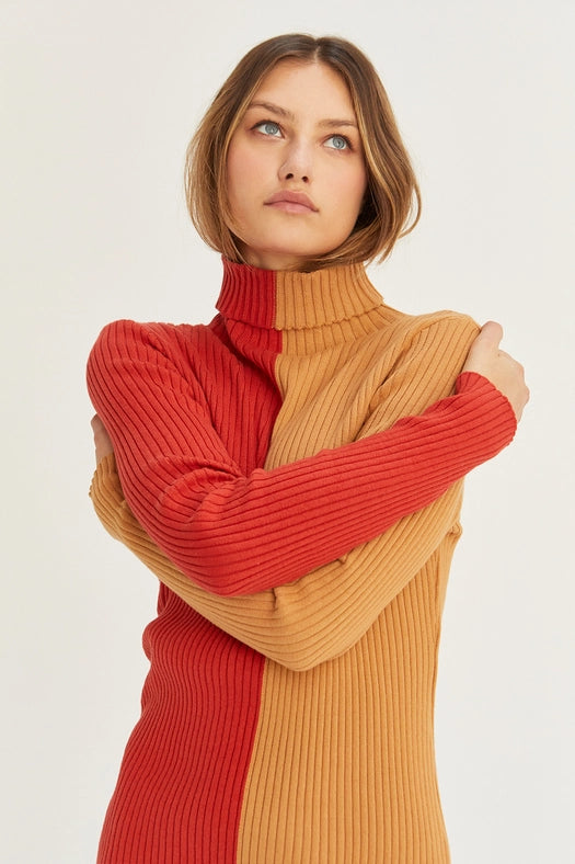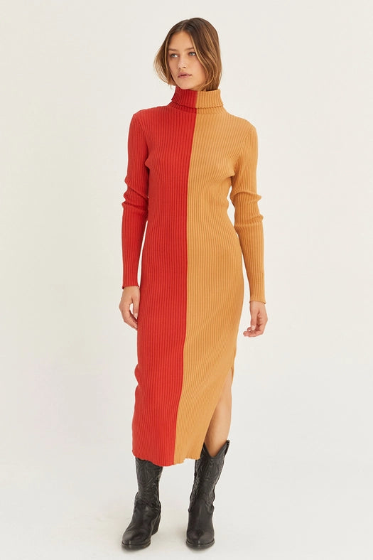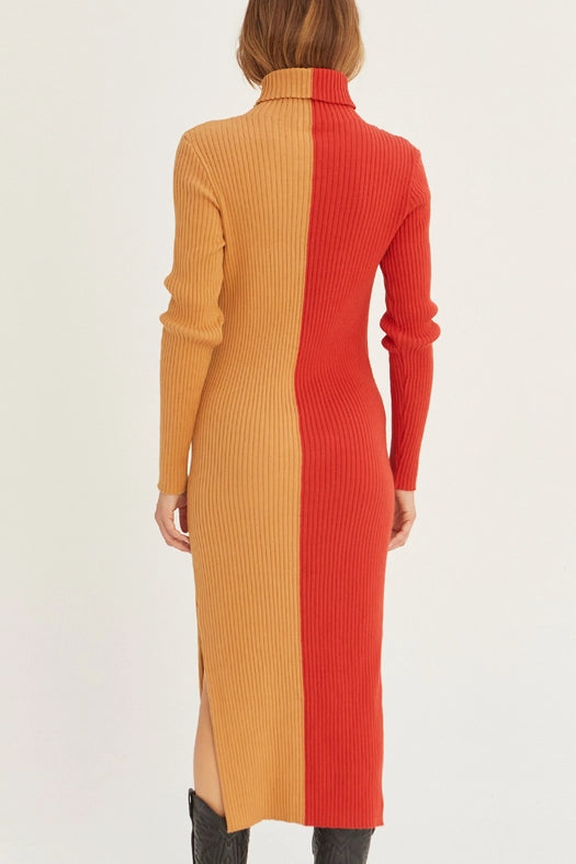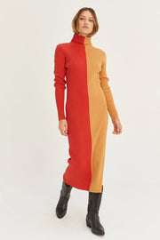 Introducing the Jodie Colorblock Midi Sweater Dress. Made from a comfortable and durable blend of 60% cotton and 40% acrylic, this dress features a classic turtle neck and a flattering midi length. Stay warm and stylish this season with this must-have dress.