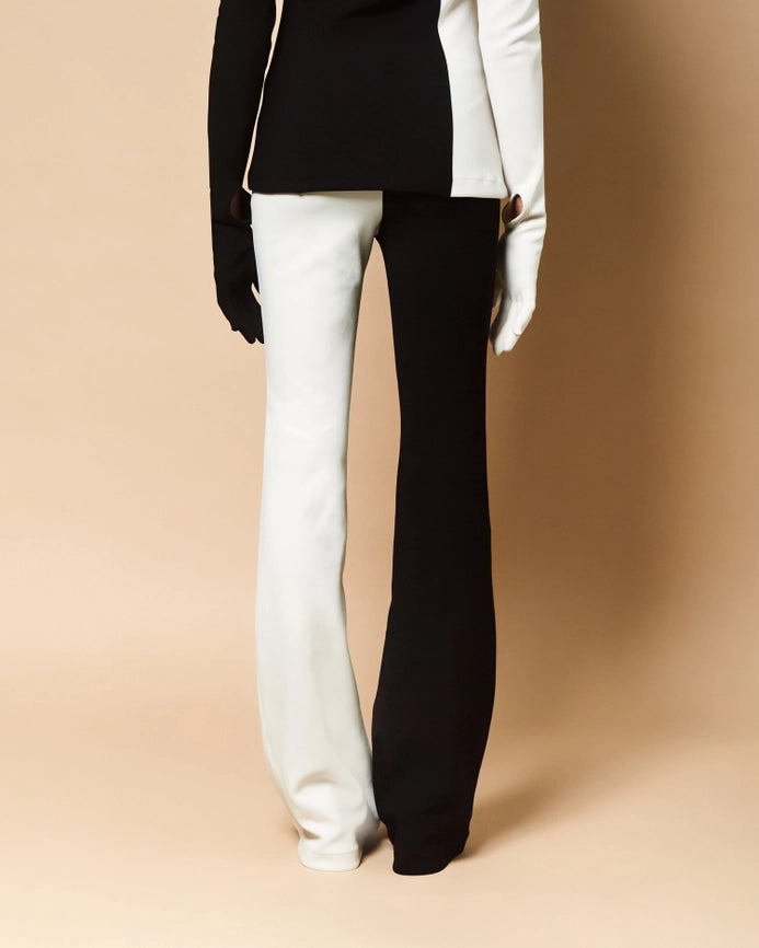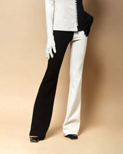 Expertly tailored for supreme comfort and ease of movement, the Josephine flare pant is a versatile wardrobe staple. Its form-fitting design, high waist, and flared cuffs offer a flattering silhouette, while the jersey crepe fabric adds a touch of luxury. Shown in black and champagne.