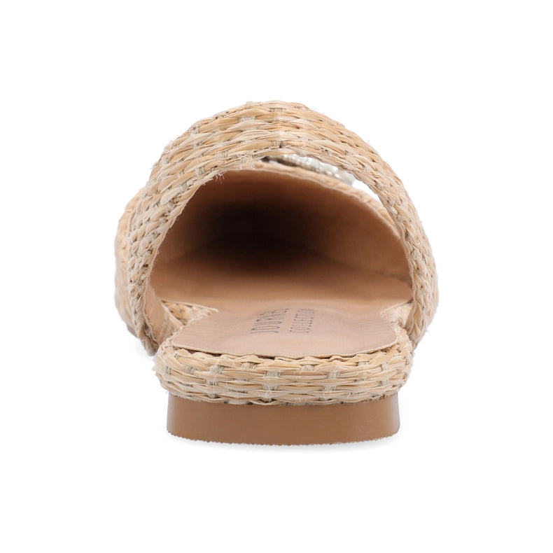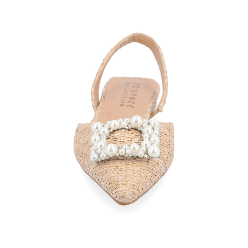 The Journee Collection Hannae wide-width flat offers both style and durability with its man-made construction. The pull-on design and padded footbed provide convenience and comfort in a chic pointed-toe silhouette. Elegant pearl hardware and a flat sole complete the sophisticated look.
