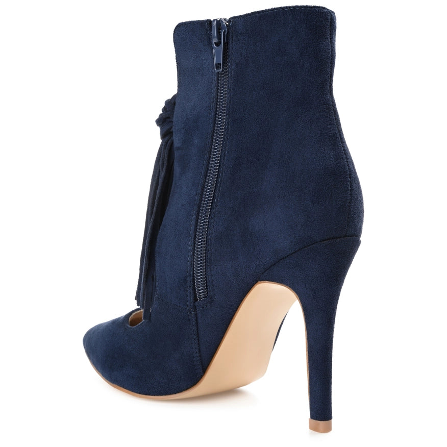 Introducing the Journee Collection Women's Tru Comfort Foam™ Cameron Bootie. With a sultry pointed-toe design and keyhole accent, these high-ankle stilettos are a must-have for any fashion-forward wardrobe. Slip them on easily with the inside zipper, while enjoying the added comfort of a 4 mm Tru Comfort Foam™ insole. Made with vegan leather, they offer both style and ethical appeal.