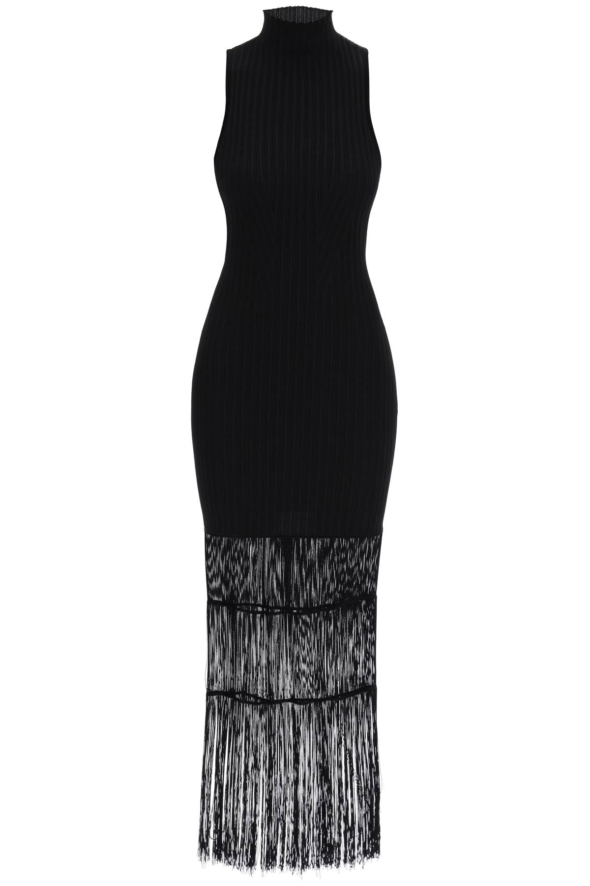 Introducing the Zare dress by Khaite. Crafted from a ribbed stretch viscose blend, this sleeveless dress features a high neck and a fitted silhouette for a flattering look. Adorned with fringe details, it adds a touch of texture and movement. Available in classic black, this 2024 design is perfect for any occasion.
