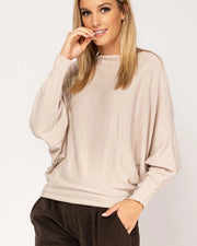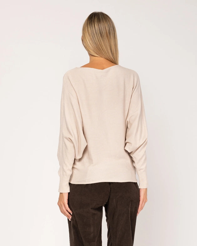 Knitted sweater with boat neck and bat sleeve