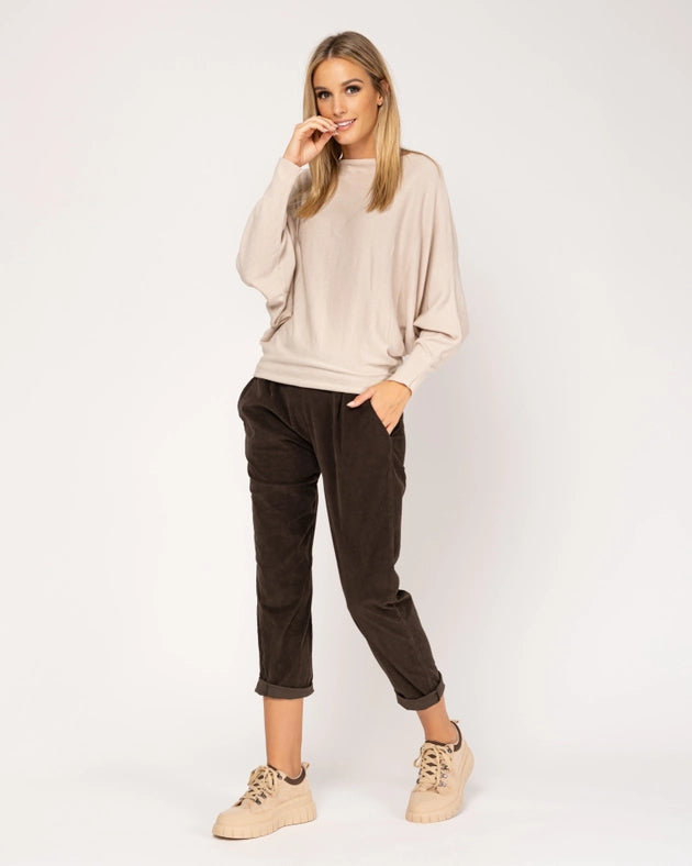 This expertly designed knitted sweater features a boat neck and bat sleeves, providing both style and comfort. With its soft material and unique details, this sweater is the perfect addition to any wardrobe. Stay warm and fashionable with this must-have piece.