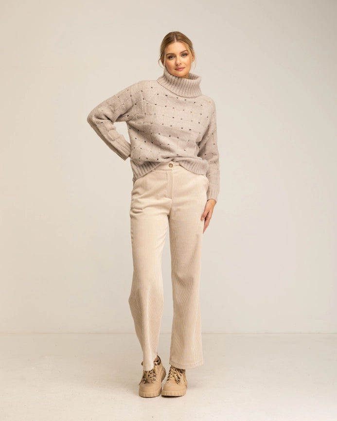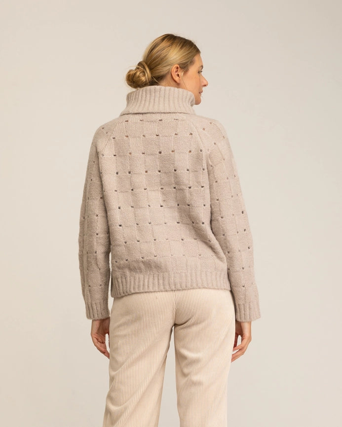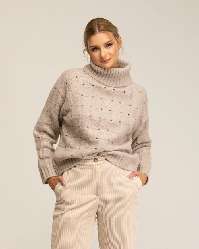 Expertly crafted from a blend of 60% acrylic, 25% polyester, and 15% wool, this knitted sweater boasts a luxurious fur effect and unique perforations. The round neck adds a touch of sophistication to this cozy and stylish piece. Stay warm and fashionable in this must-have winter essential.