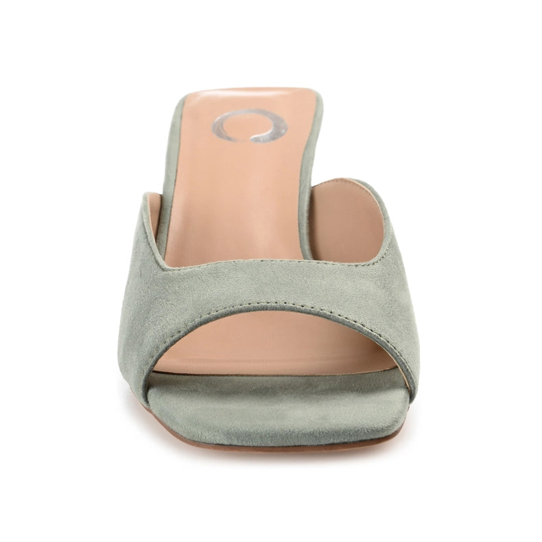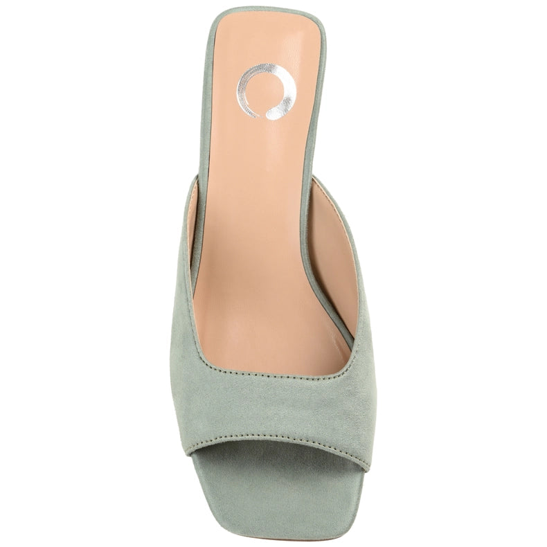 Introducing the Larna Peep Toe Kitten Heels in Faux Suede by Journee Collection. These slip-on style heels boast vegan leather uppers, a square toe box, and a 2-inch heel for a retro look. With a padded insole, these kitten heels offer both comfort and style, making them perfect for any occasion.