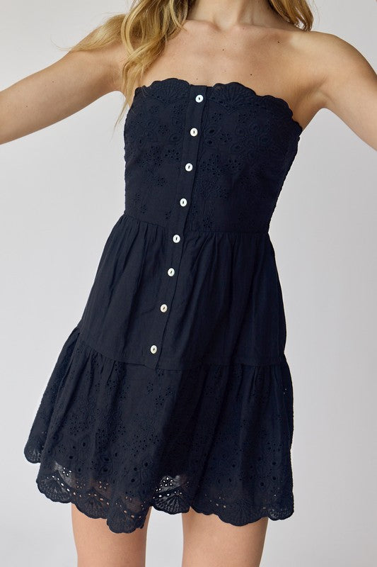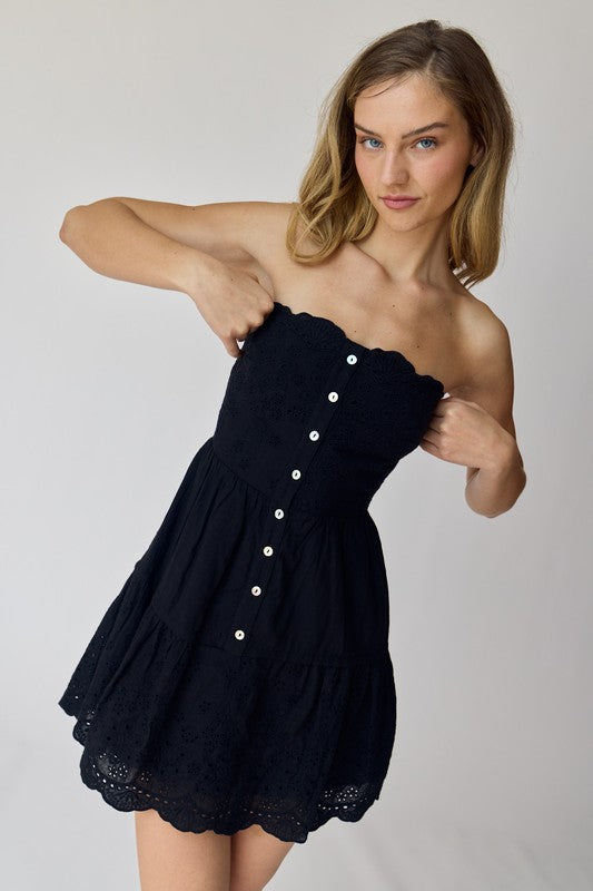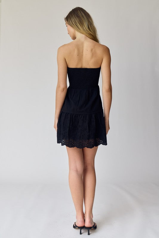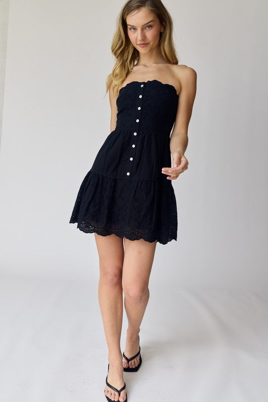 The Leah Strapless Eyelet Mini Dress is a stylish and versatile addition to your wardrobe. This dress features a strapless design and eyelet detailing, giving it a chic and feminine look. Made of 100% cotton, it offers both comfort and breathability. With a length of 26 1/2 inches and chest measurement of 14 5/8 inches, it is the perfect fit for any occasion. Its model stands at 5'9" and is wearing a size S, making it a great option for all body types. Elevate your style with this must-have dress.