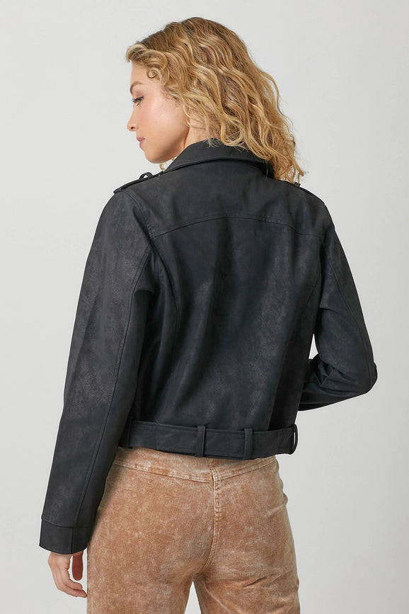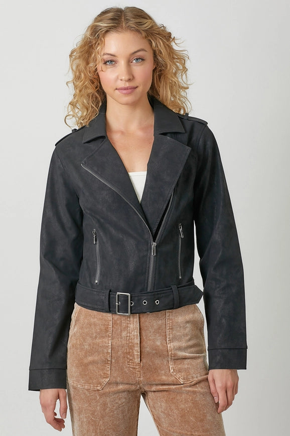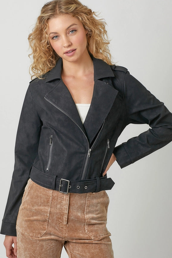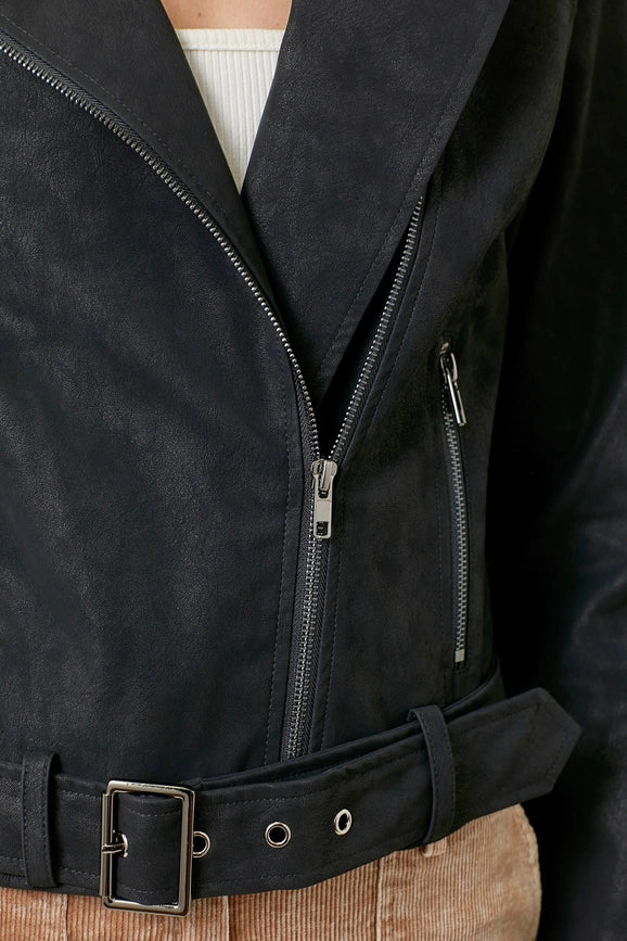 Stay stylish and edgy with our Leather Moto Jacket. This versatile piece features a waist belt for a flattering fit and side zipper pockets for added convenience. The asymmetric zipper front completes the look, making it a must-have for any fashion-forward individual.