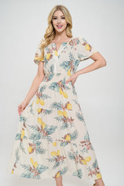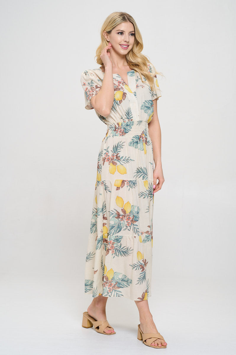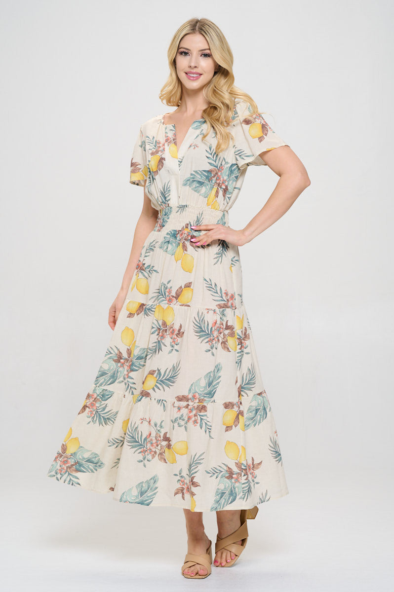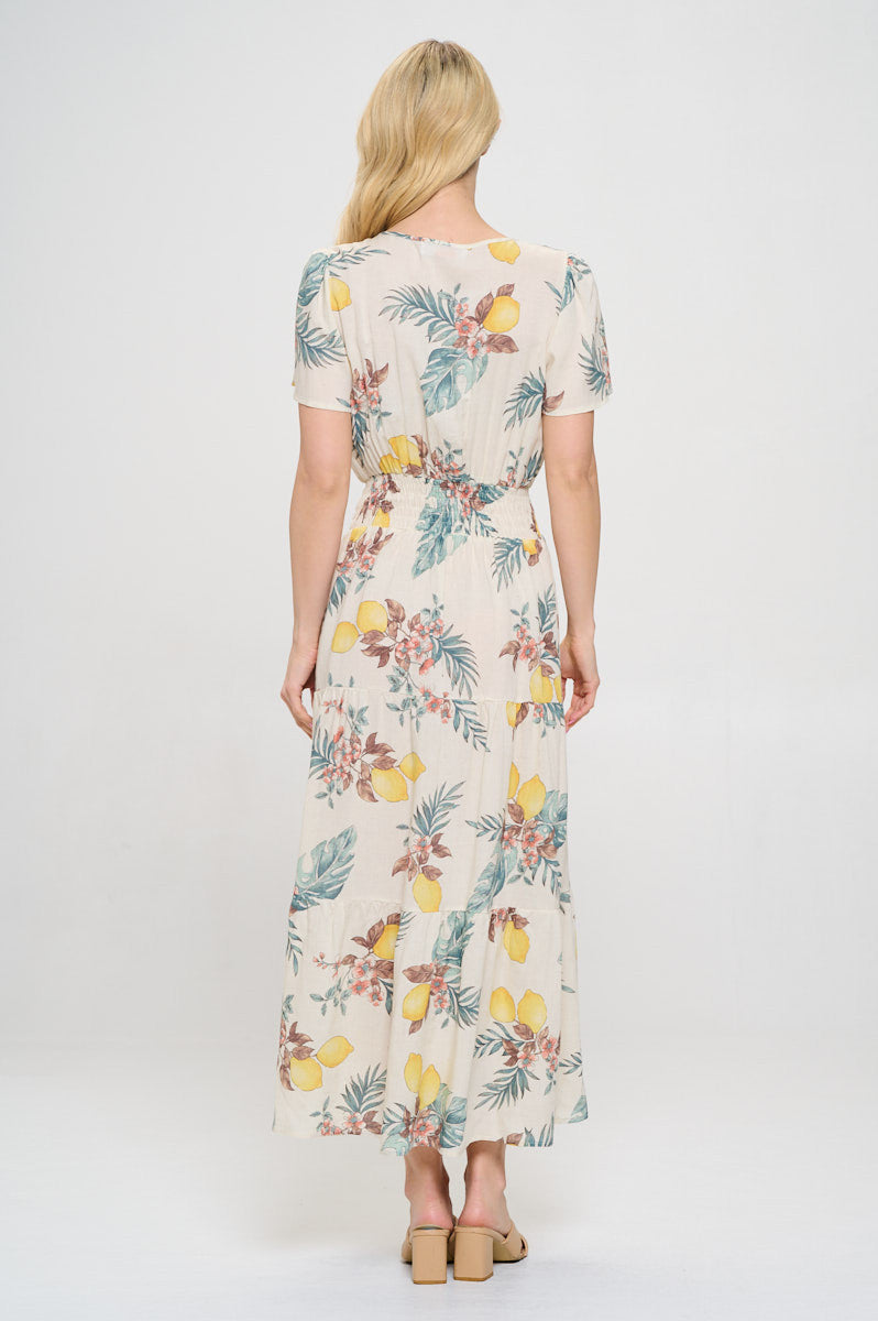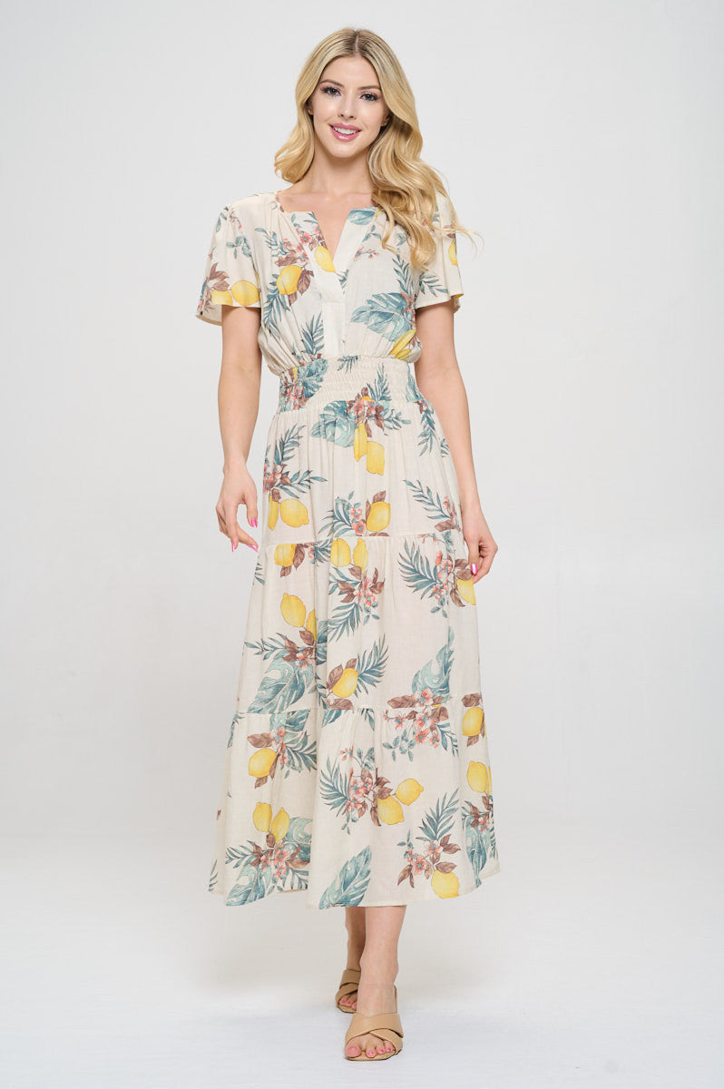 Lemon Print V neck Short Sleeve Tiered Dress-Dresses-Reneecollection-Small-TAUPE-Urbanheer