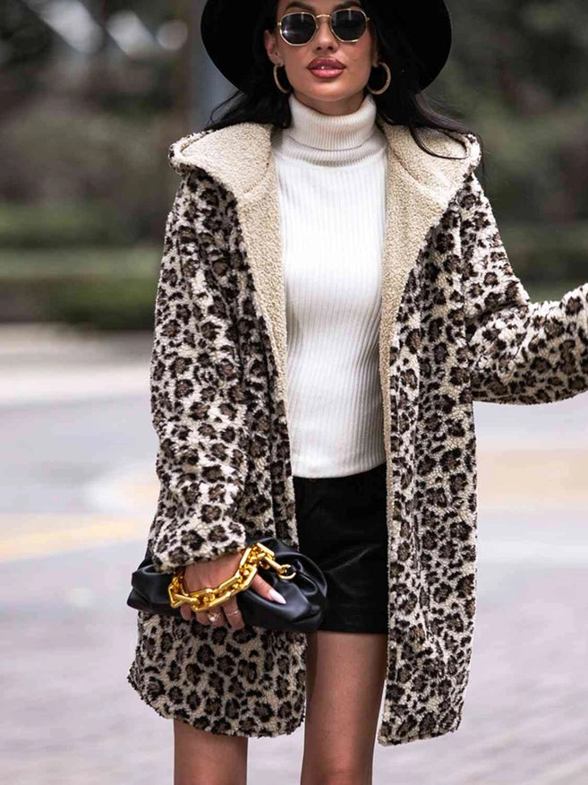 Expertly crafted from thick 100% polyester material, this Leopard Hooded Coat with Pockets offers a basic yet chic style. Its imported design features a comfortable fit with a length of 35.5 inches and a bust of 44.5 inches. Machine washable for easy care, it's perfect for staying warm and fashionable in any weather.