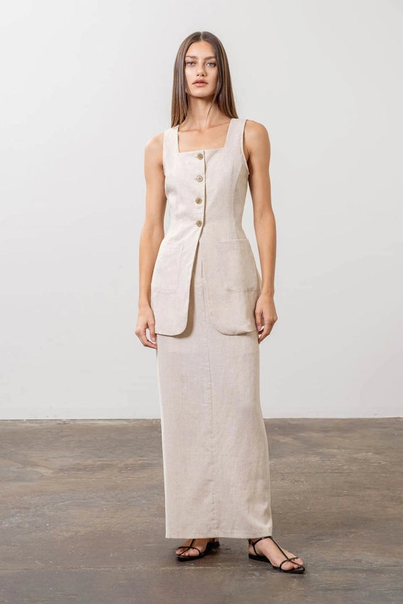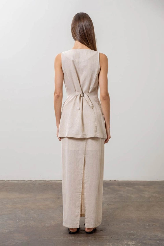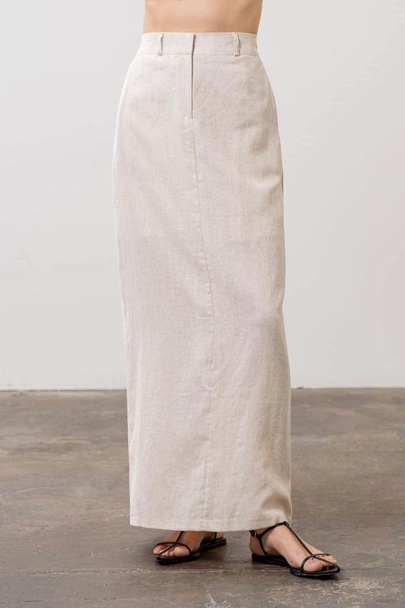 This linen blend high waist pencil maxi skirt offers a sleek, elongating silhouette with a comfortable fit. Crafted from a durable 70% cotton and 30% linen shell, it features a front hook closure and a back elasticized waistband for ease and adjustability. The maxi length and back split hem add elegance and freedom of movement. Fully lined with 100% polyester, the solid color design ensures versatility and comfort, making this skirt a sophisticated and practical addition to any wardrobe.