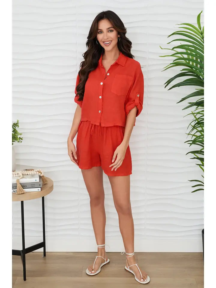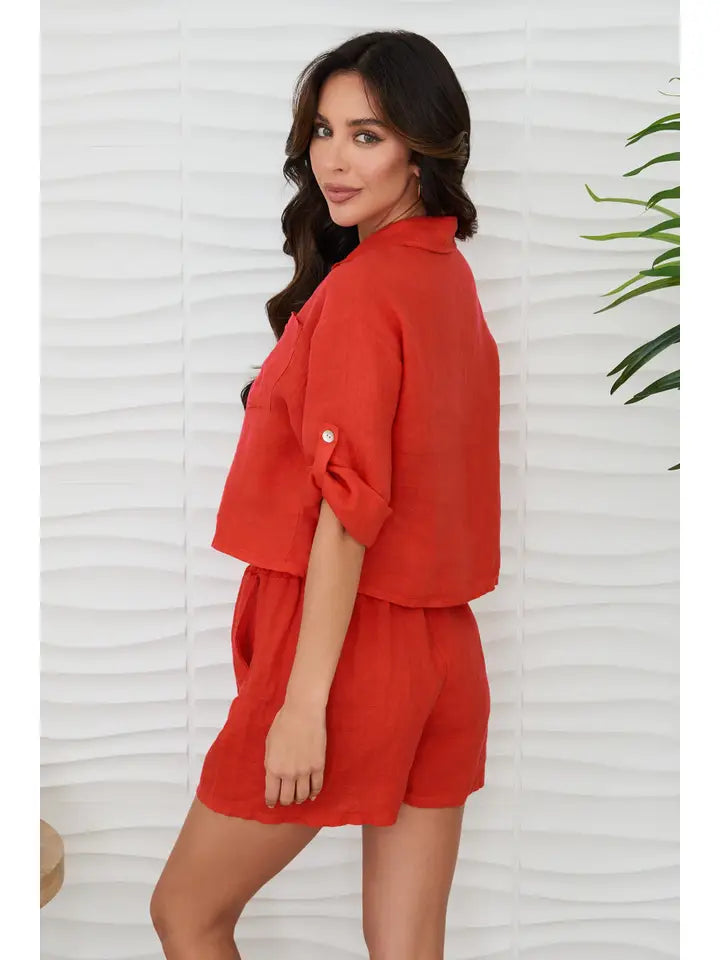 This expertly crafted linen button-up top combines breathability and style, perfect for spring and summer wear. Made in Italy from 100% linen, it features roll-tab sleeves for adjustable comfort and a front pocket that adds both function and a refined casual touch. Ideal for staying cool on warm days or layering under a jacket for versatile, polished looks.
