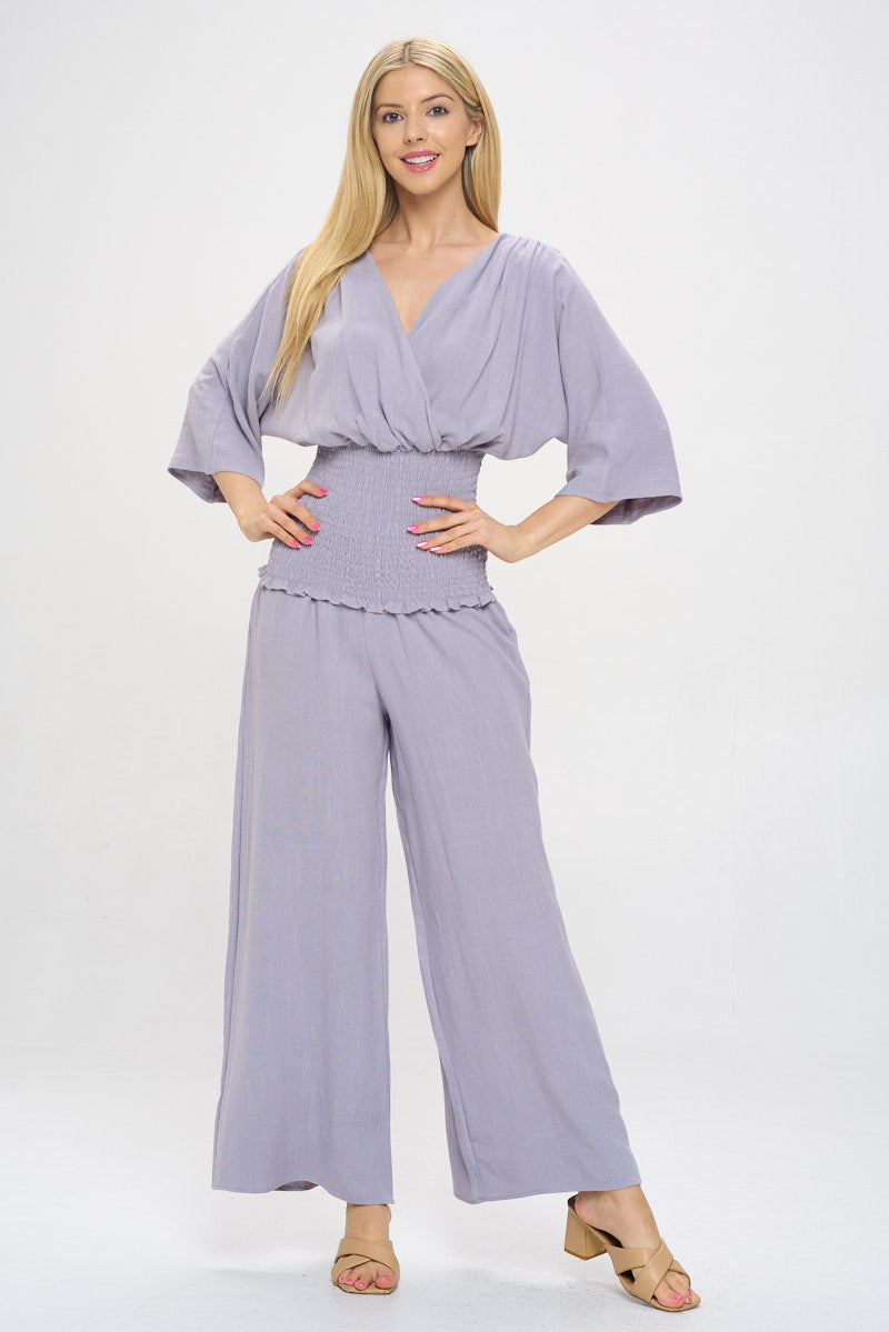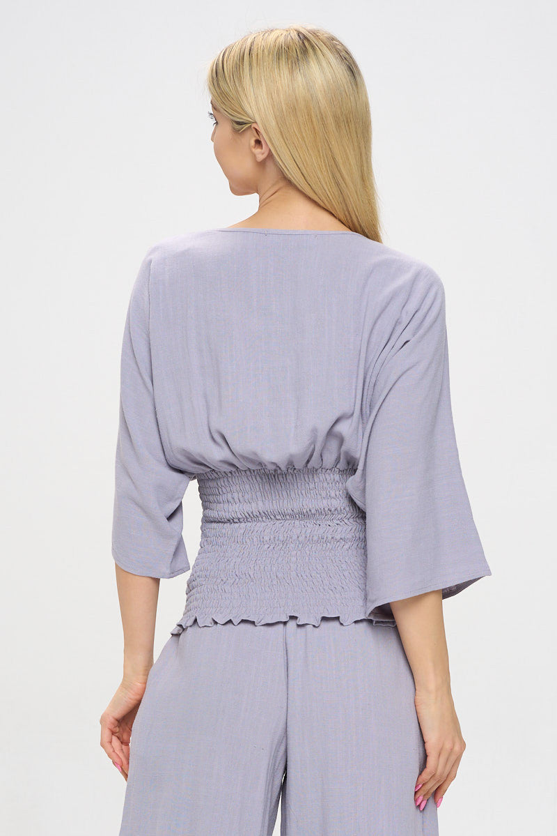 Linen V neck Smocked Dolman Sleeve Top