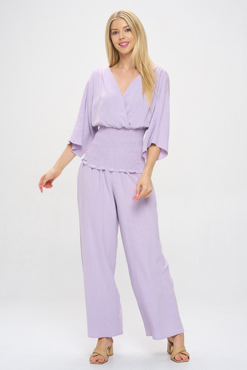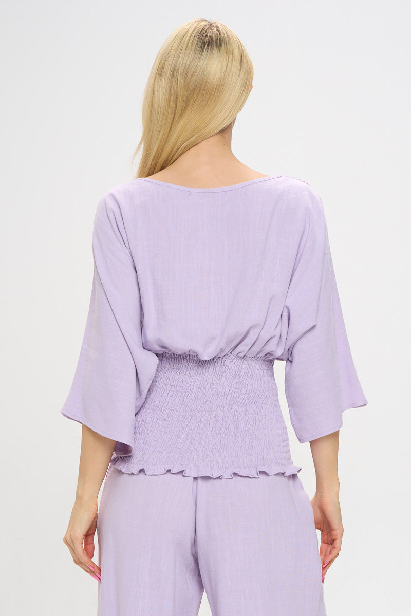 Made in Linen V neck Smocked Dolman Sleeve Top. Available in other Colors. Fabric content: 70% Rayon, 30% Linen.
