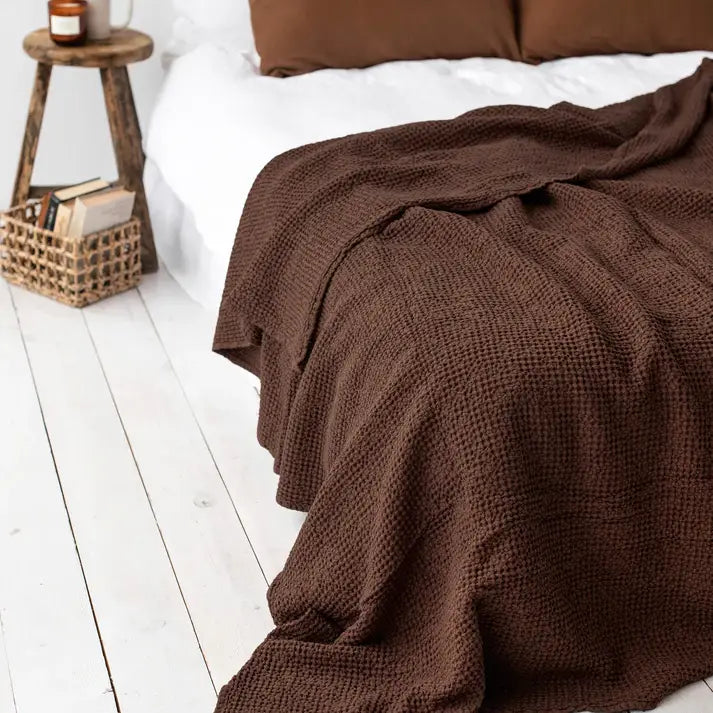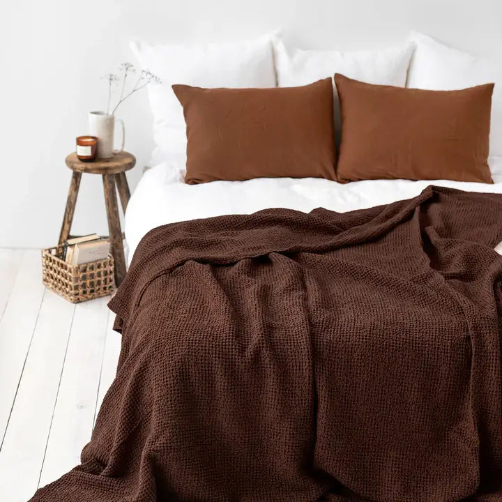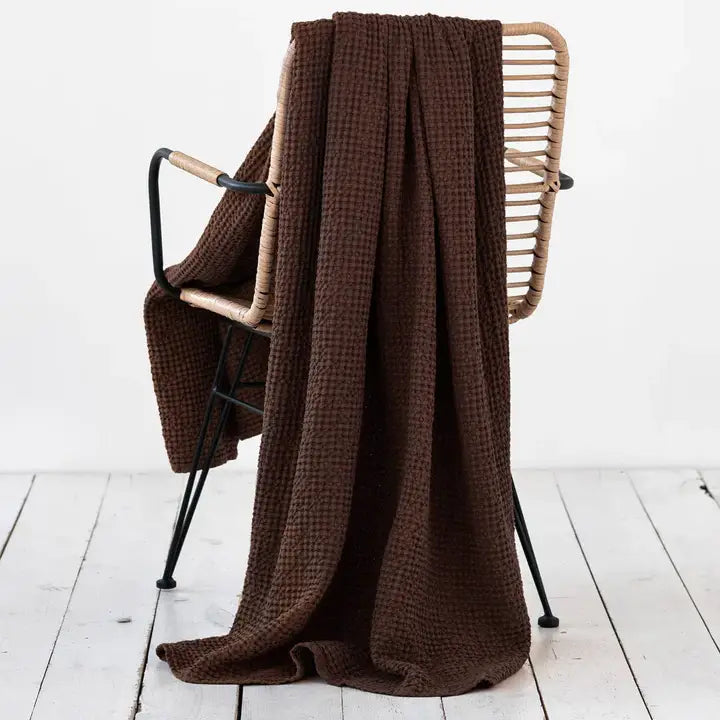 This Linen Waffle Blanket in Dark Chocolate combines the natural breathability of linen with the softness of cotton for year-round comfort. Its cozy waffle weave and midweight fabric provide warmth without heaviness, making it perfect as a sofa cover, bed throw, or wrap. Stone washed for extra softness and OEKO-TEX certified, this versatile blanket adds a stylish, comfortable layer to your living space. Made in Lithuania and easy to care for with machine washability.