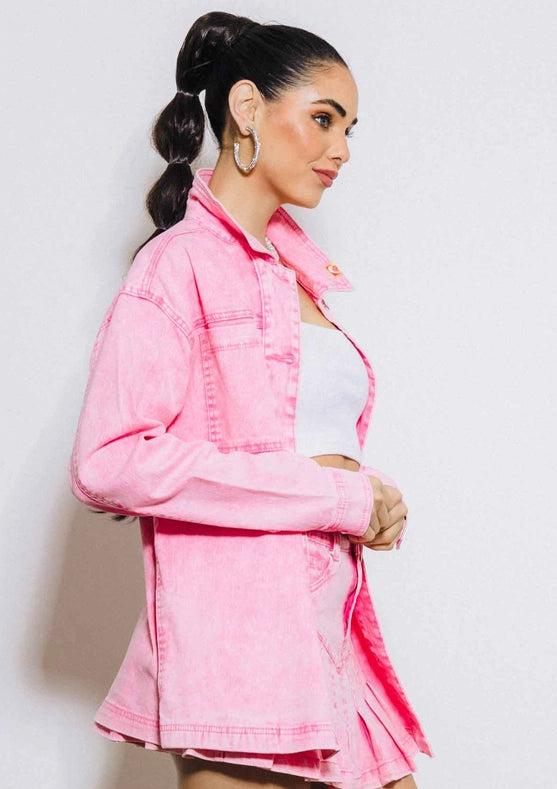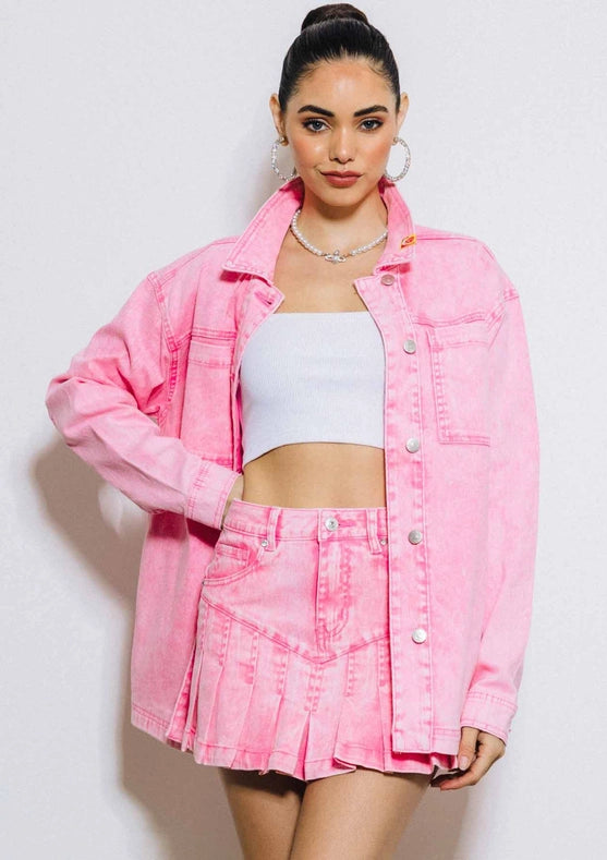 Expertly designed for style and functionality, the Lizzy Denim Shaket is a must-have addition to your wardrobe. With a trendy acid wash coloring, convenient front pockets, and a classic button-up closure, this shaket provides both fashion and practicality. Stay on-trend and organized with this versatile piece.
