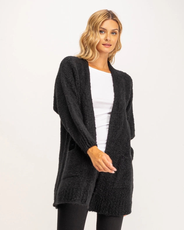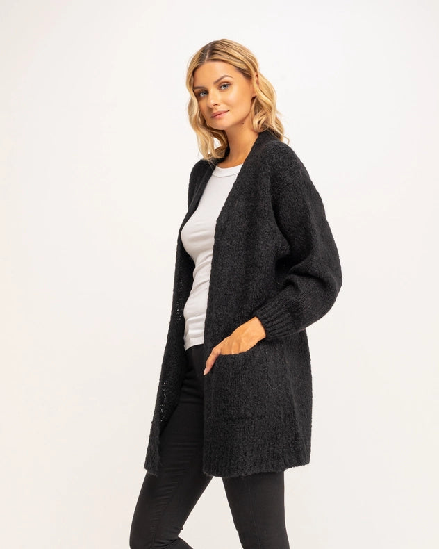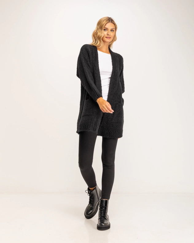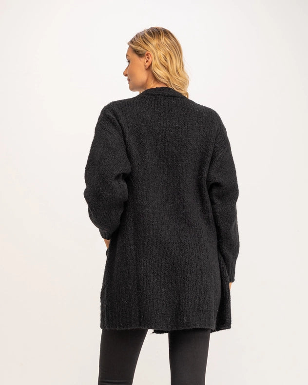 This long chunky knit jacket with front pockets offers both warmth and style. Its chunky knit design provides a cozy and comfortable fit, while the front pockets offer convenience for storing small items. Perfect for staying warm and fashionable in colder weather.