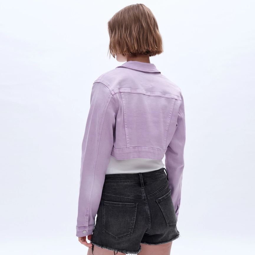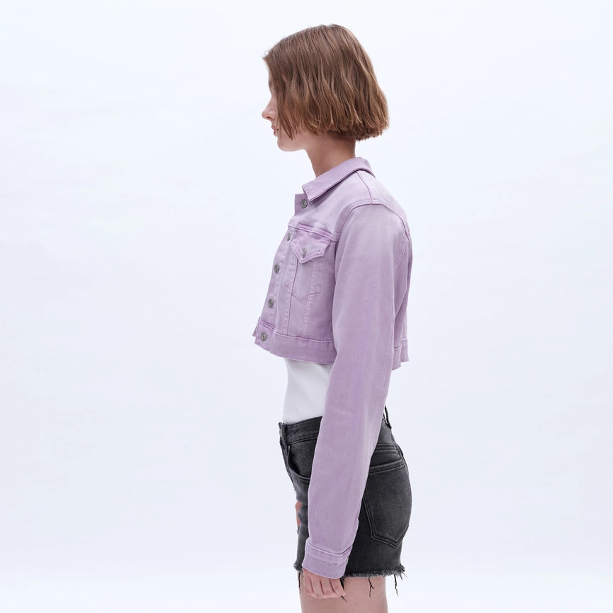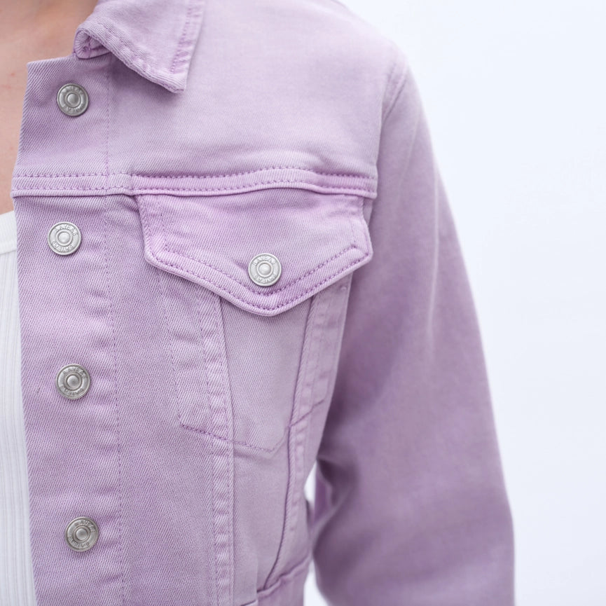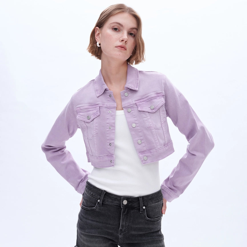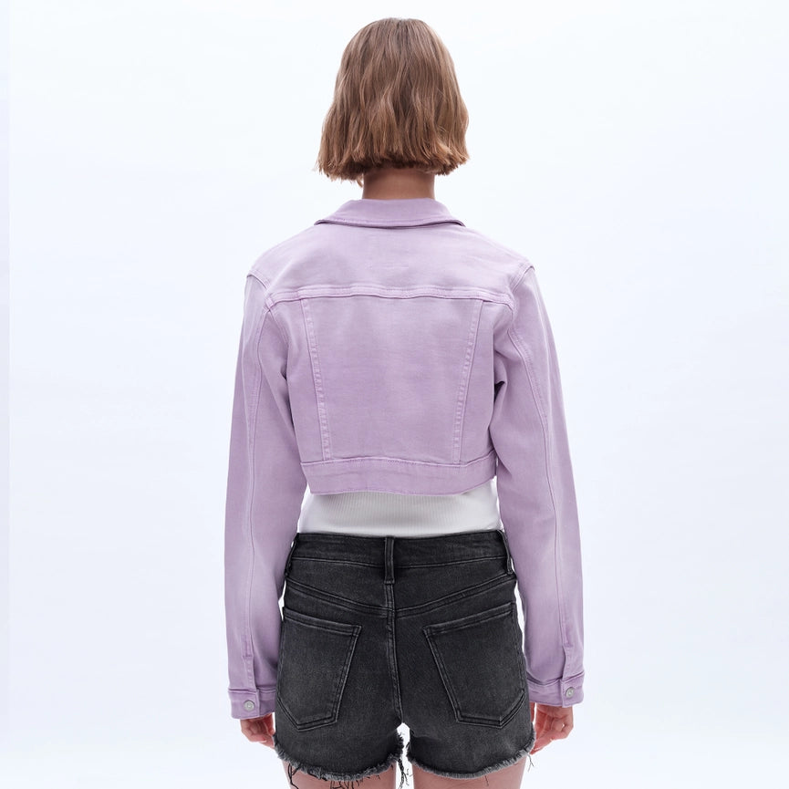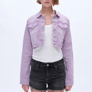 Introducing our Long Sleeve Cropped Twill Jacket, crafted from super stretch denim for ultimate comfort and flexibility. The garment dyed finish in a vibrant purple hue gives this jacket a unique and trendy look. Featuring two chest pockets, a button placket, and a collared neckline, this cropped jacket is perfect for spring and summer seasons.