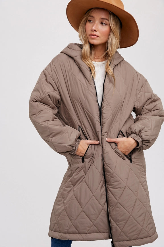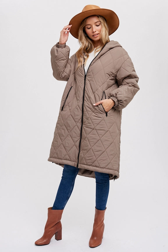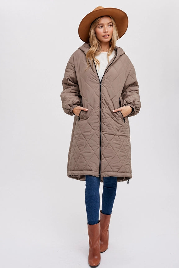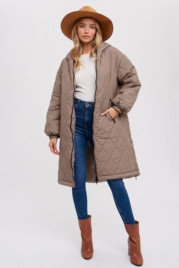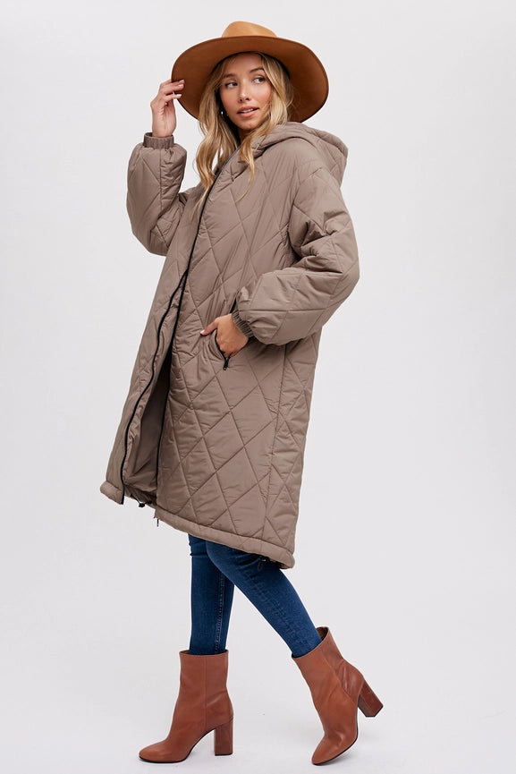 Stay stylish and warm with our Longline Quilted Puffer Jacket. Featuring a functional hoodie, zipper front, and lightweight woven outerwear, this jacket offers both fashion and practicality. The quilted design provides insulation and warmth, perfect for cooler weather. A must-have versatile addition to your wardrobe.
