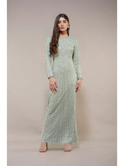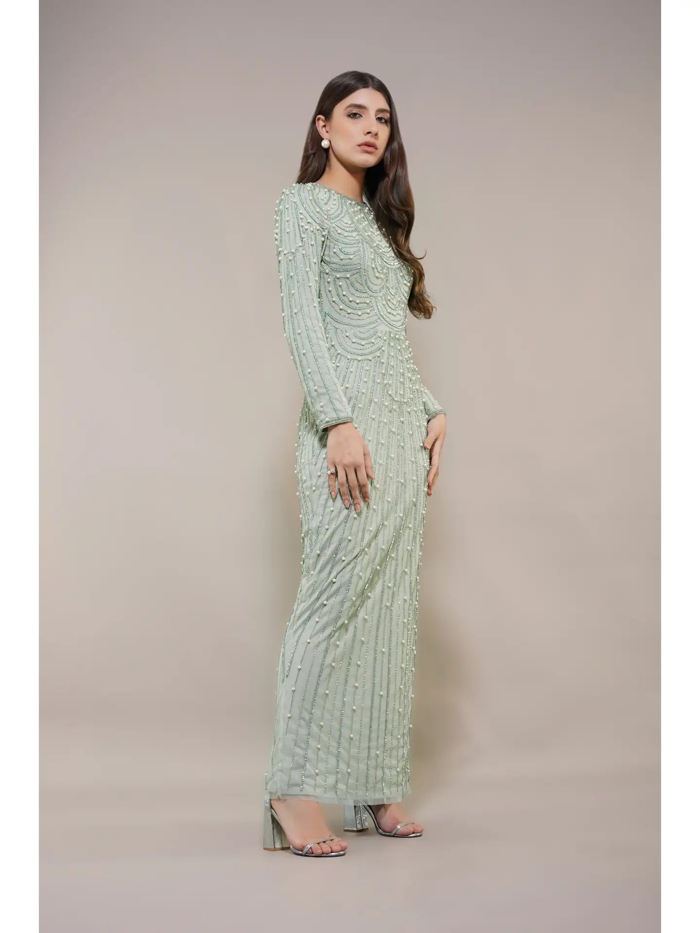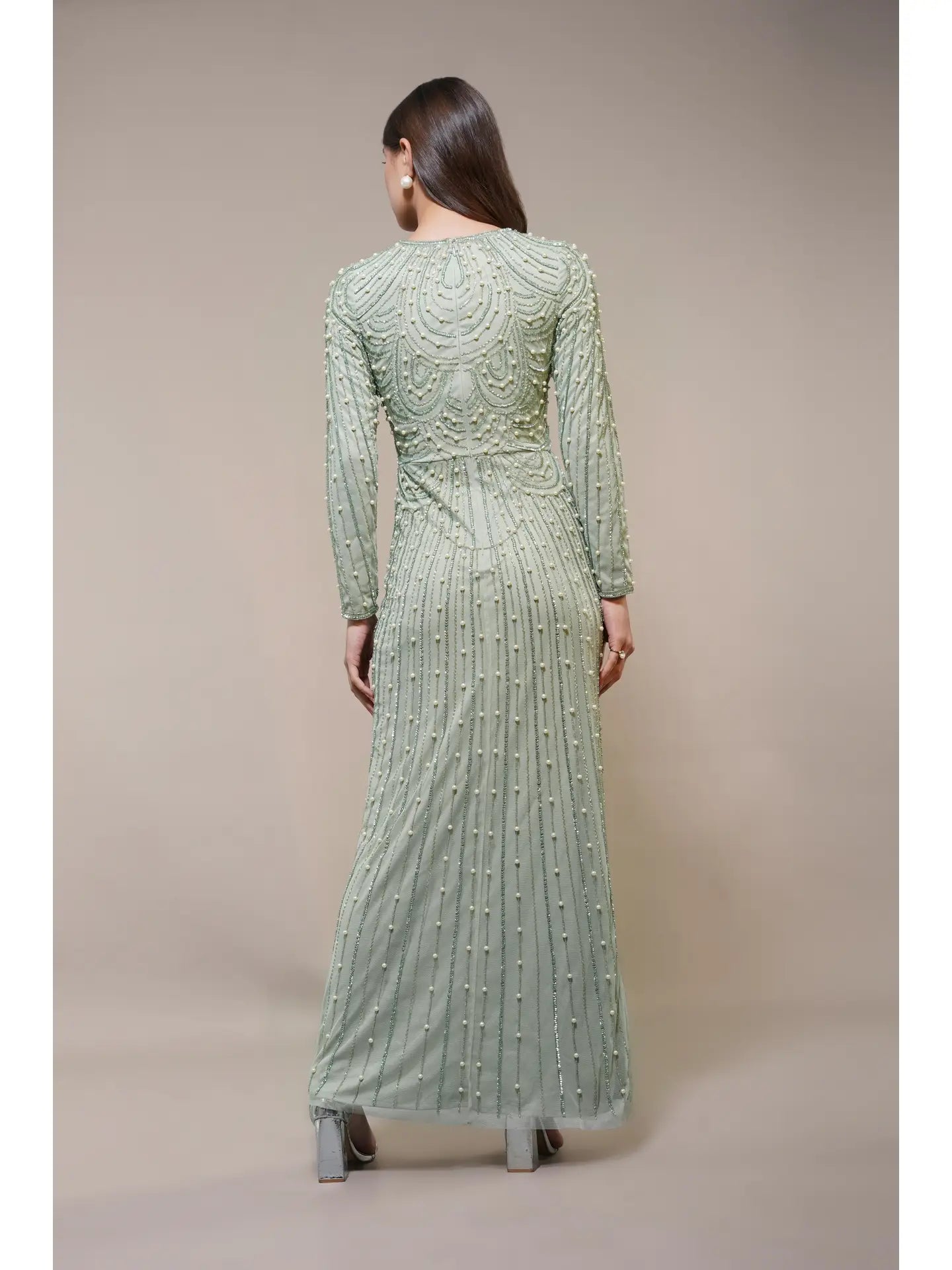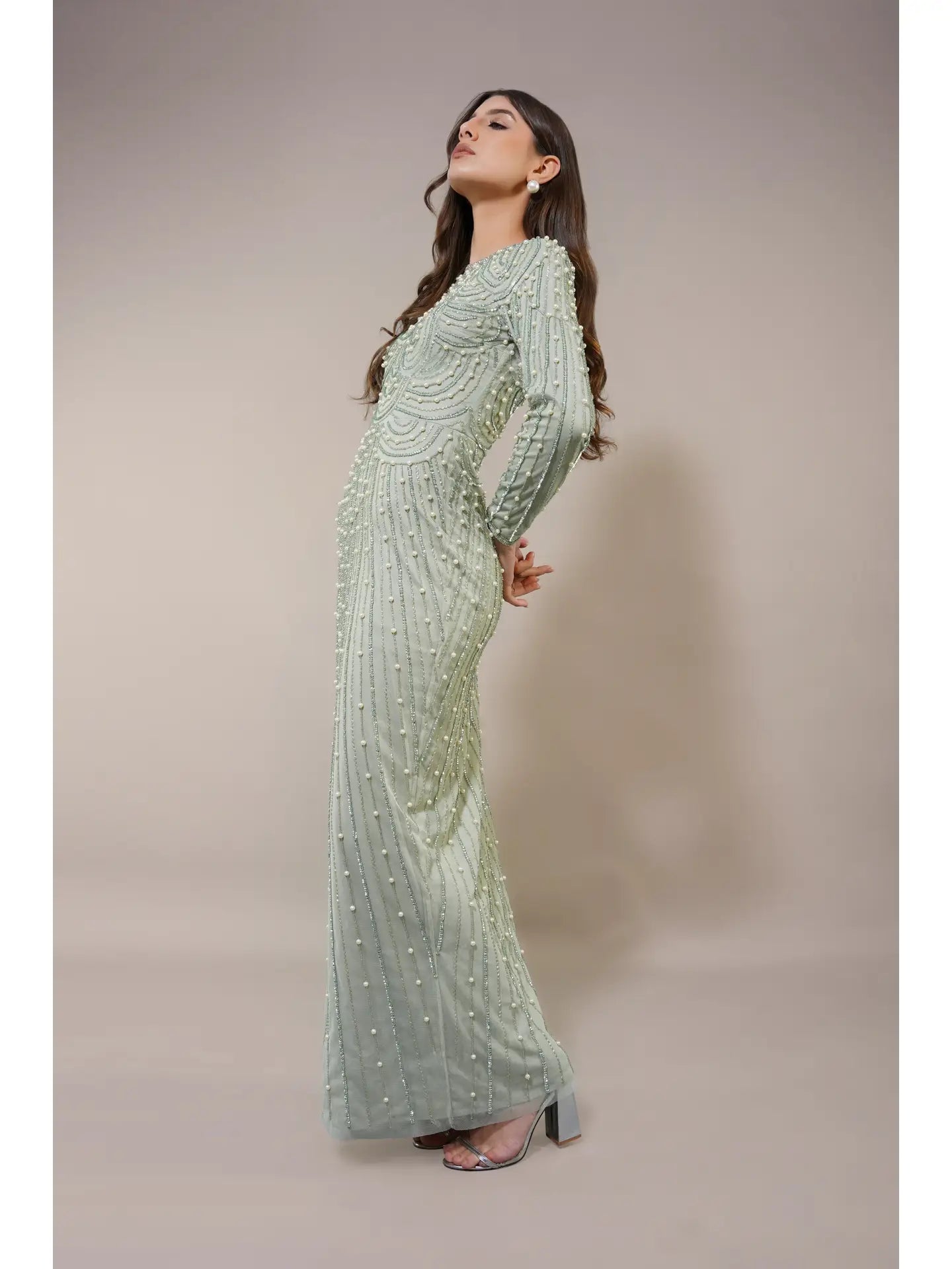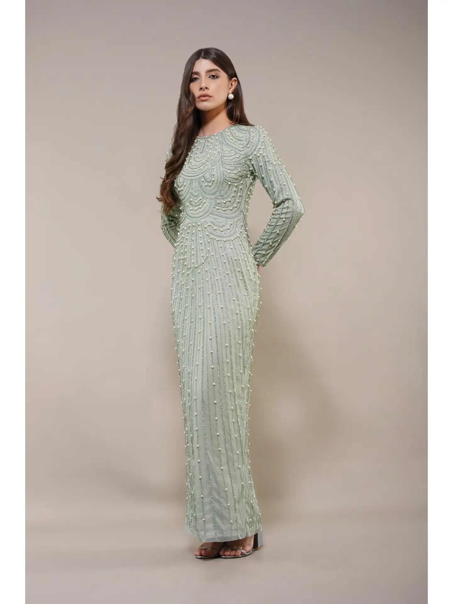 The Mabel Embellished Maxi Dress in Pistachio expertly blends vintage charm with modern sophistication. Hand-embellished beadwork, a high neckline, and long sleeves create a modest yet elegant silhouette. Its figure-skimming fit and delicate pearl details evoke a refined art-deco aesthetic, making this gown an exceptional choice for weddings and special occasions where timeless style and subtle glamour are desired.