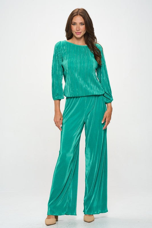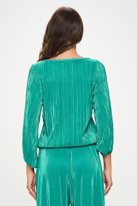 Made in USA Plisse Solid Round neck Top with 3/4 Sleeve. Fabric content: 100% Polyester. Available in other Colors.