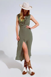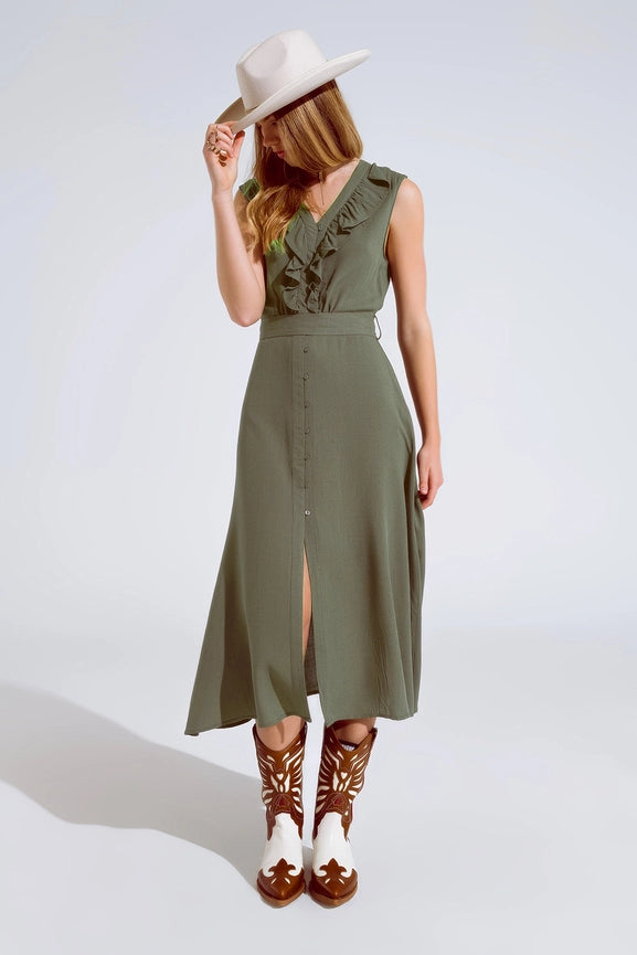 Maxi Dress in Khaki with Ruffle and Button Detail