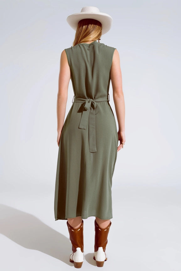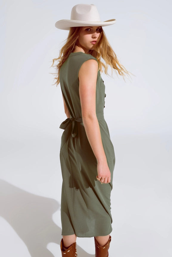 Maxi Dress in Khaki with Ruffle and Button Detail-Dress-Q2-S-Green-Urbanheer