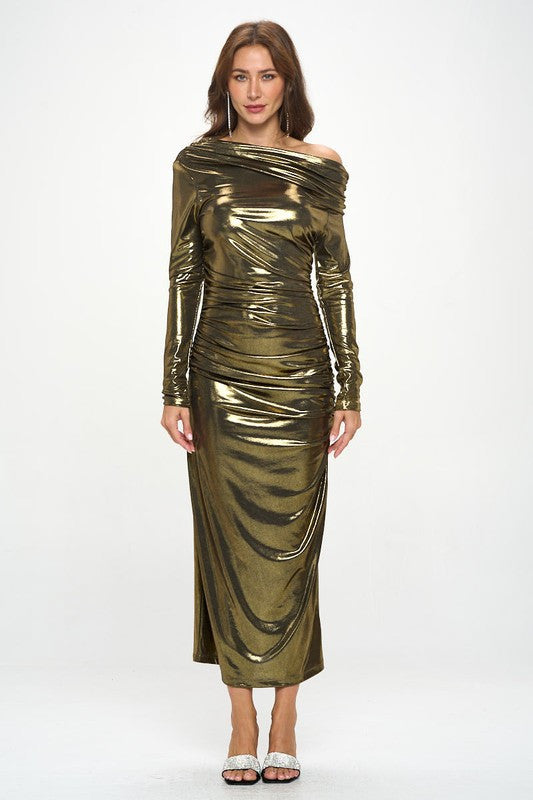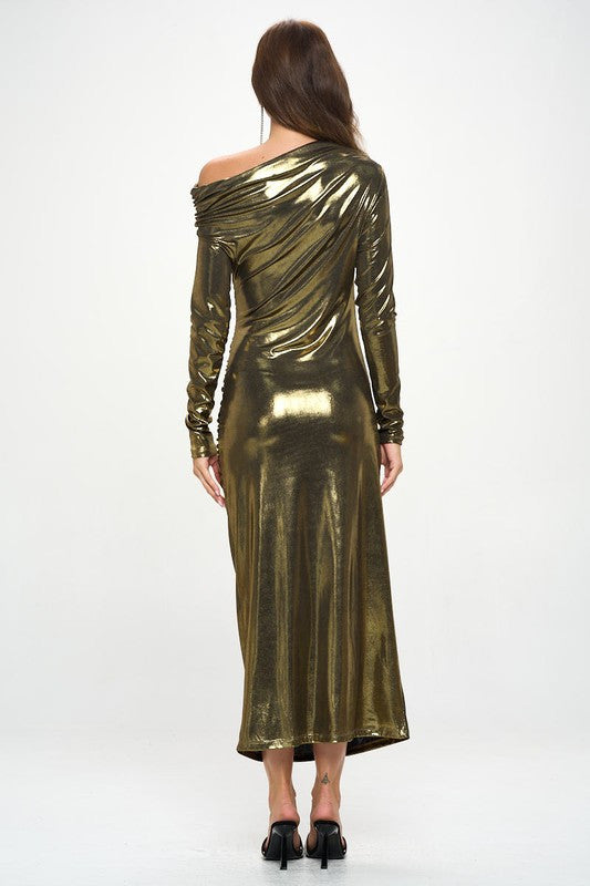 Made in USA Metallic Off The Shouder Bodycon Dress. Fabric content: 95% Polyester, 5% Spandex.