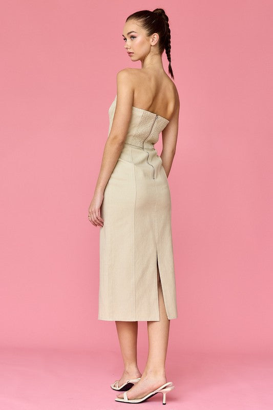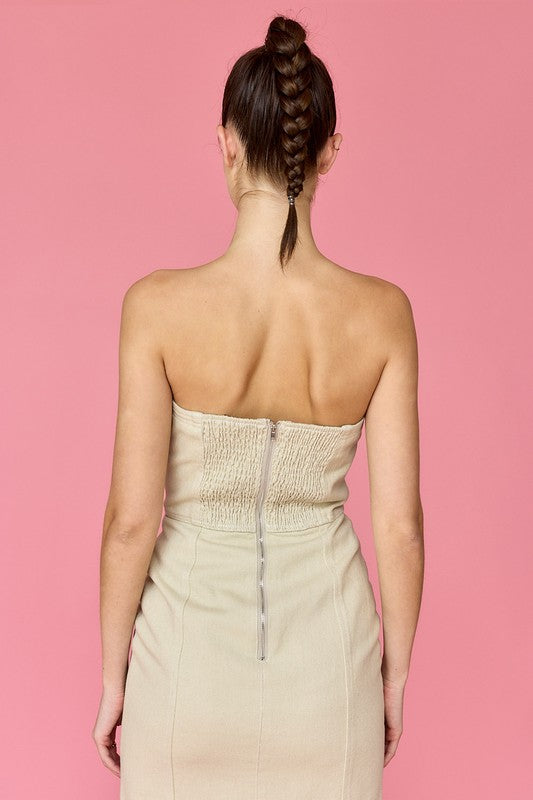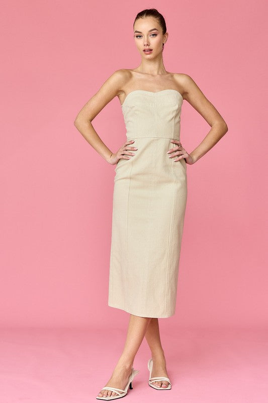 Expertly tailored, the Mia Strapless Denim Midi Dress is perfect for any occasion. Made from 100% cotton for maximum comfort, the strapless design is both stylish and flattering. With a length of 41 1/2 inches and a chest measurement of 14 7/8 inches, this midi dress is the perfect addition to your wardrobe.