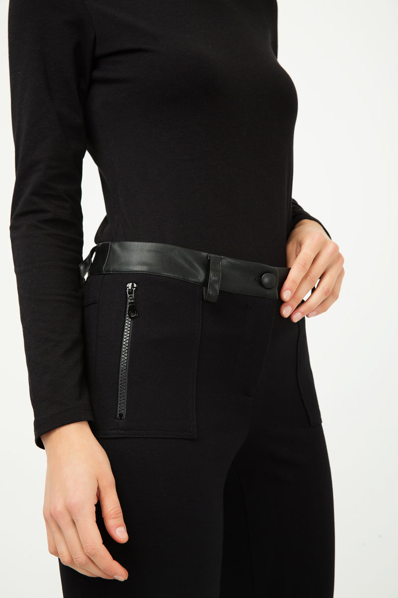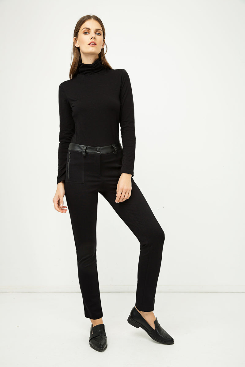 Long black jeggings in stretch Punto di Roma fabric. Pleather at the waistband and belt loops. 2 small external pockets in the front which fasten with a thick metal zip. Fastens in the front with a zip and pleather button. Mid rise. Length: 96cm.Our model is 178cm and is wearing size 36.