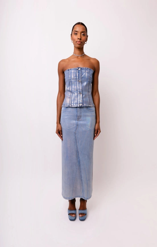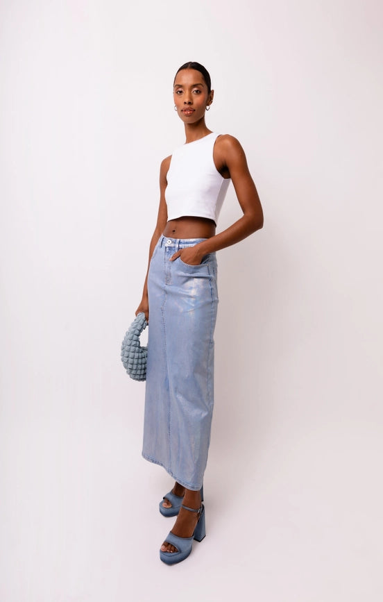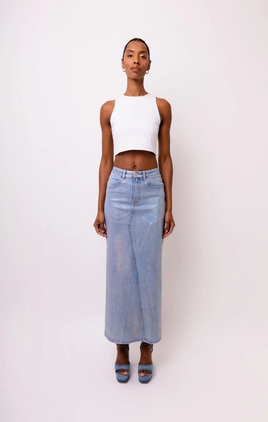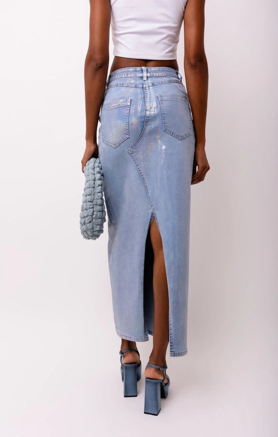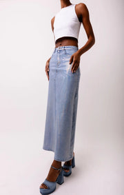Mimi Stretch Metallic Light Denim Maxi Skirt