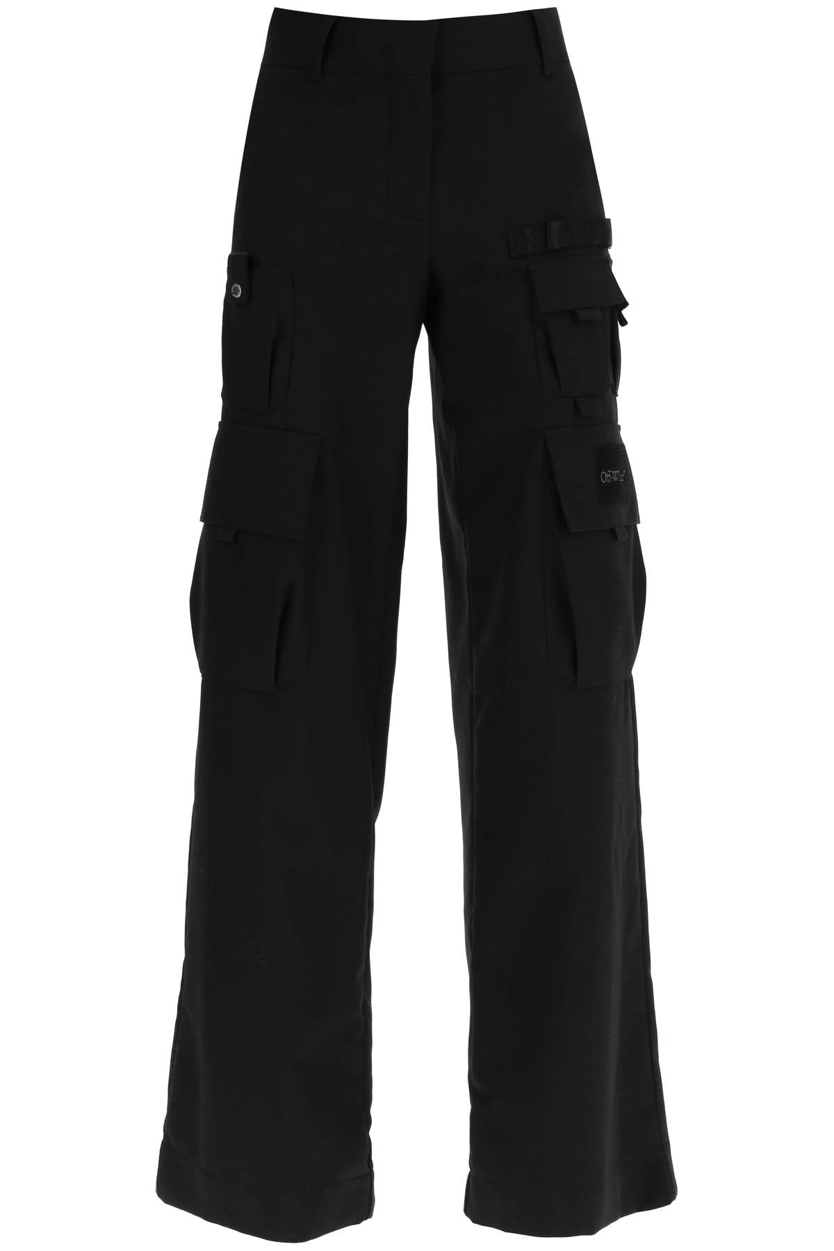 Off-White cargo pants made of pure wool twill with a wide-leg cut and maxi length. Enriched by multiple pockets and a logo patch, they are finished with belt loops and front fly with hidden zip and hook-and-bars. The model is 177 cm tall and wears a size IT 40.