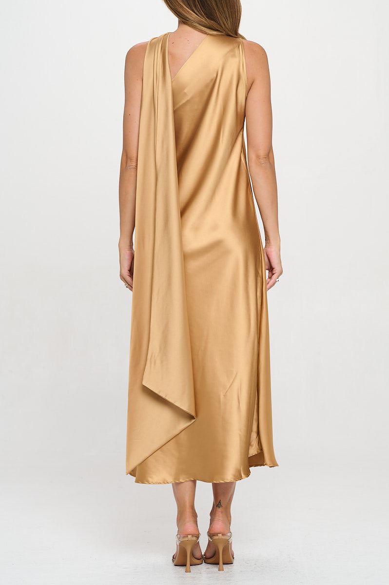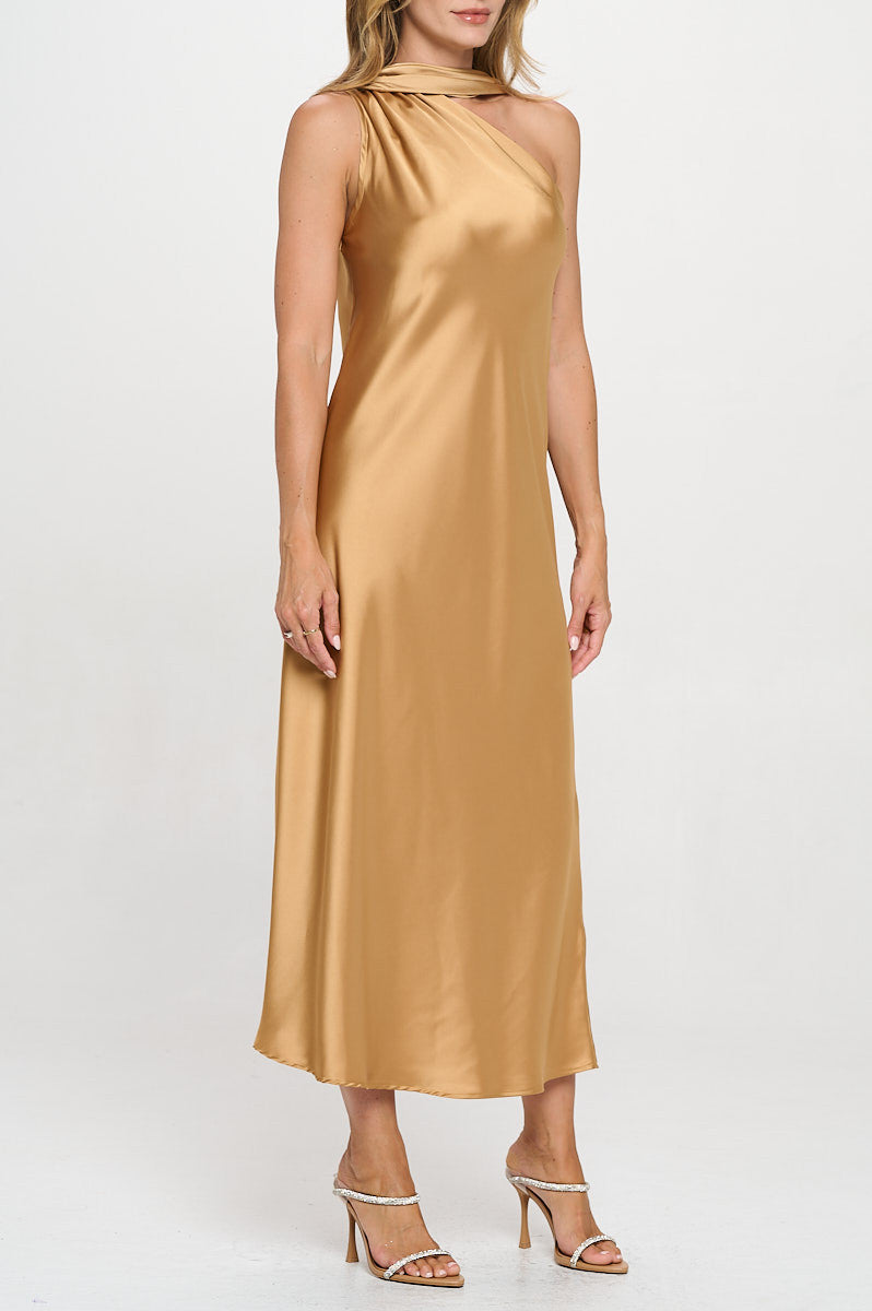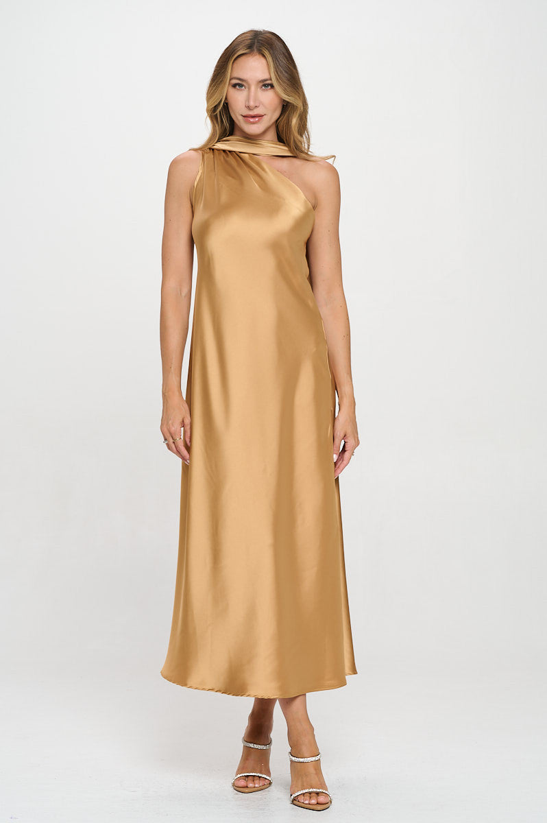 One Shoulder Satin Maxi Dress with Scarf Detail