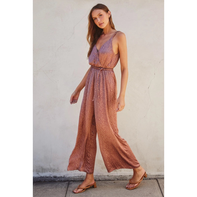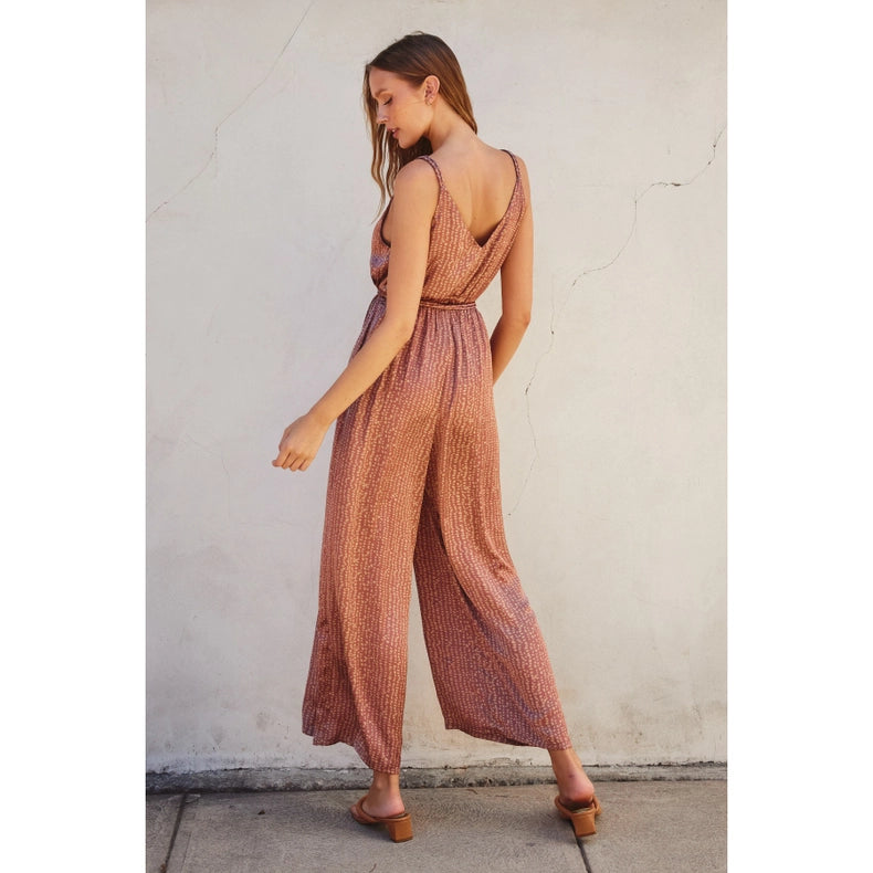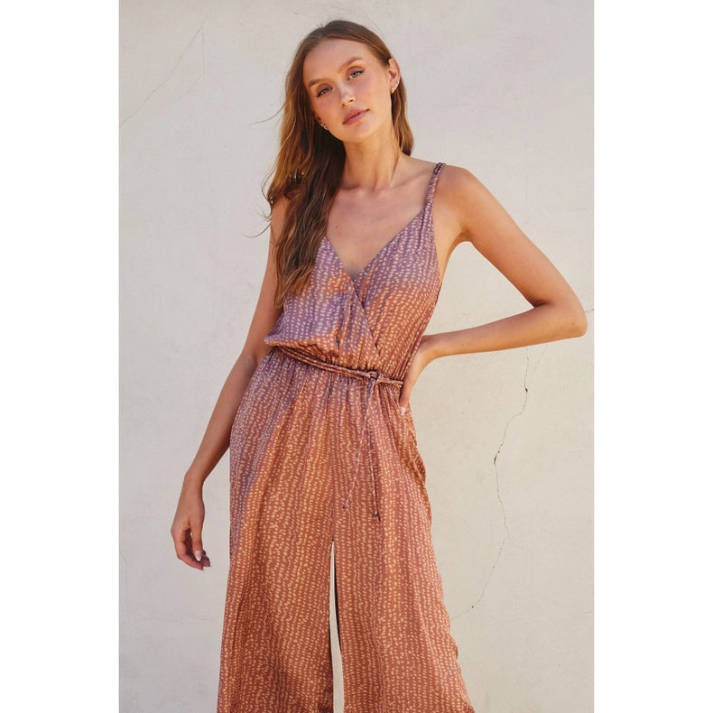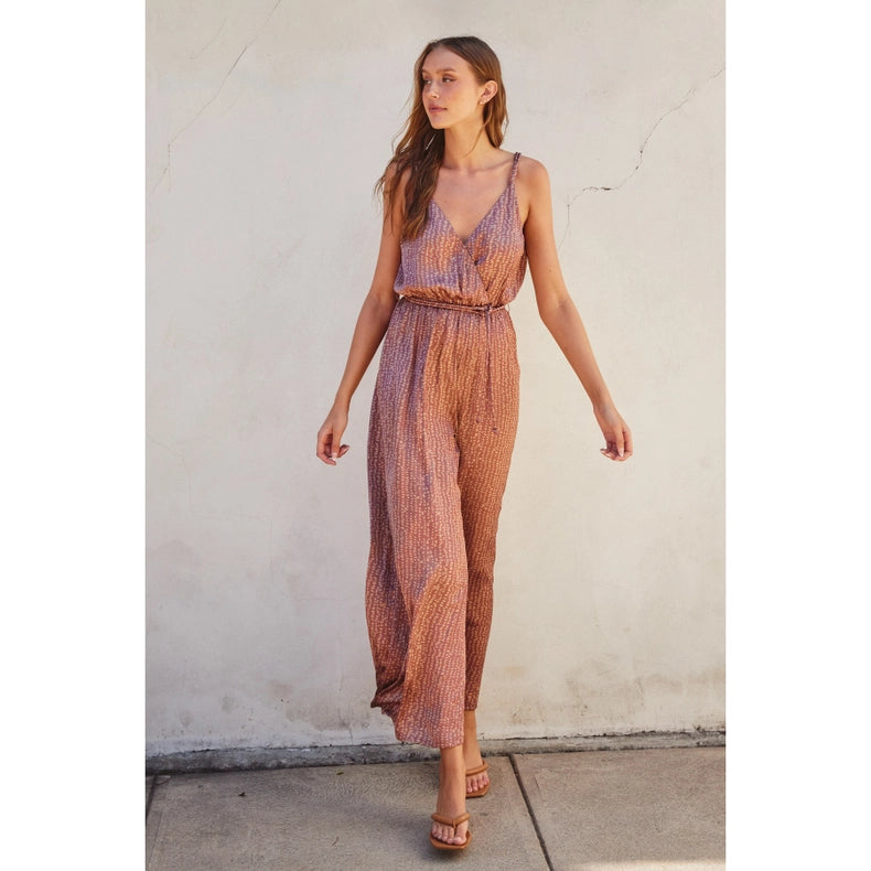 Stay stylish and comfortable with our Pebbles Cord Strap Surplice Jumpsuit. The printed design features a front surplice neckline and back V neckline for a flattering look. The pull on design and elasticated waistband provide ease of wear, while the customizable tie looped sash cord adds a touch of personalization. Made of 100% polyester shell and lining for quality and durability.