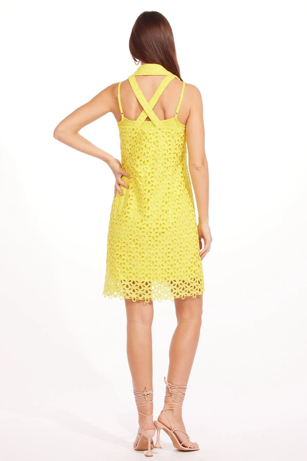 The mini length and eyelet detailing add a touch of femininity and sophistication to the dress, making it perfect for casual outings, beach parties, or even a day out in the city. The shirt dress style makes it easy to dress up or down, making it a versatile piece that you can wear for a variety of occasions.