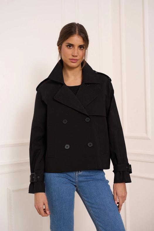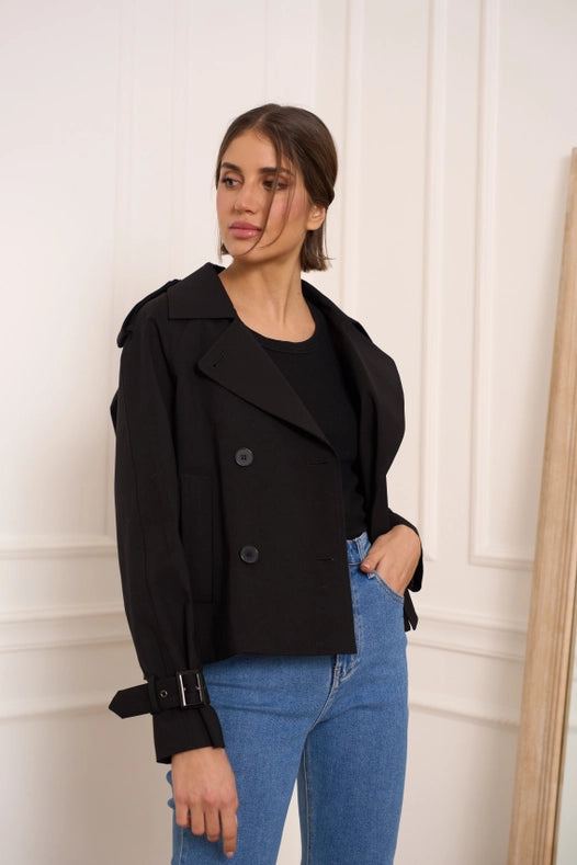 Plain Cropped Cotton Trench Coat Black