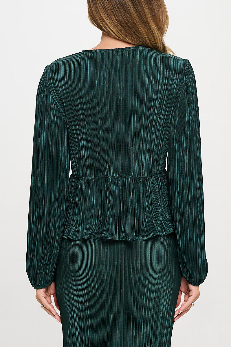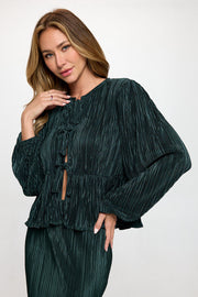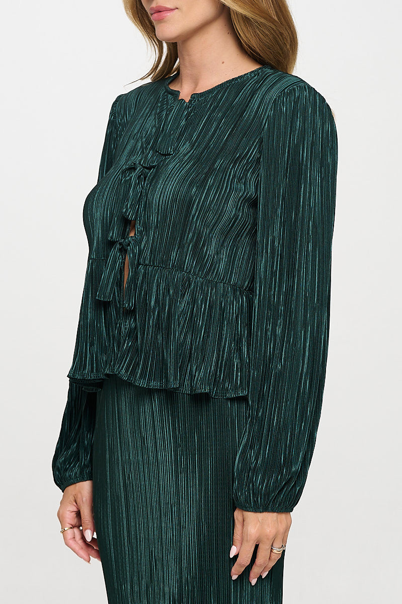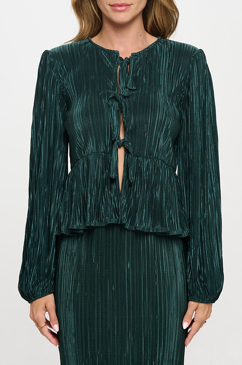 Plisse Long Puff Sleeve Top with Open Front Tie Detail