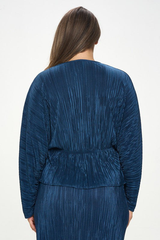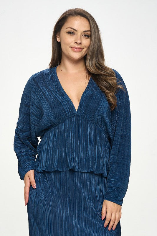 Made in USA Plisse V neck Top with Balloon Dolman Sleeve. Fabric content: 100% Polyester. Available in other Colors.