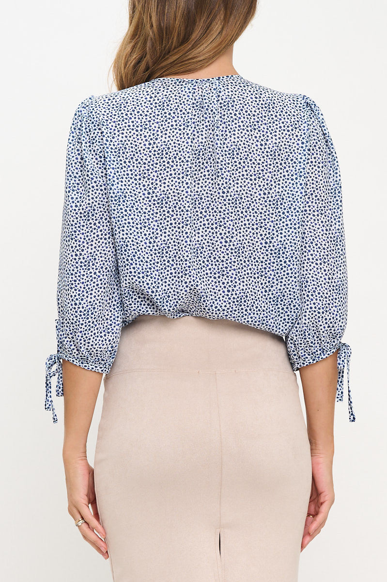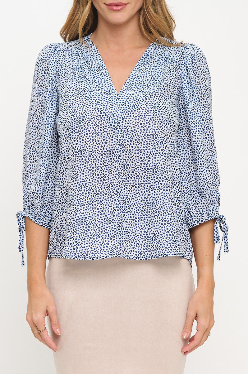 Made in USA Polka Dot V neck 3/4 Sleeve Top. Available in other Colors. Fabric content: 100% Polyester Wool Dobby.