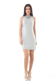 Turn heads in this fashionable, silhouette skimming two-piece striped dress. While preserving modesty but exuding mystery, a solid colour bandeau peeps from the wide arm holes. A block colour panel in the back creates eye-catching contrast. High neck. Sleeveless. Model shown is 178cm and is wearing size S/36