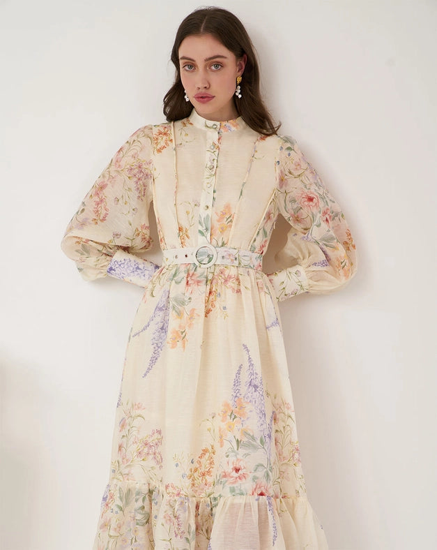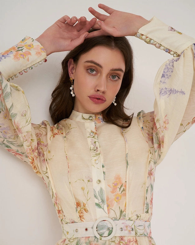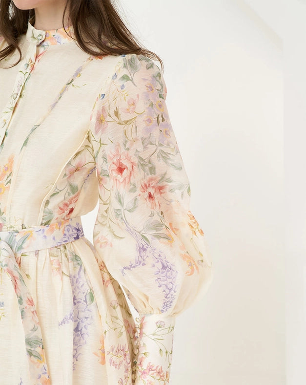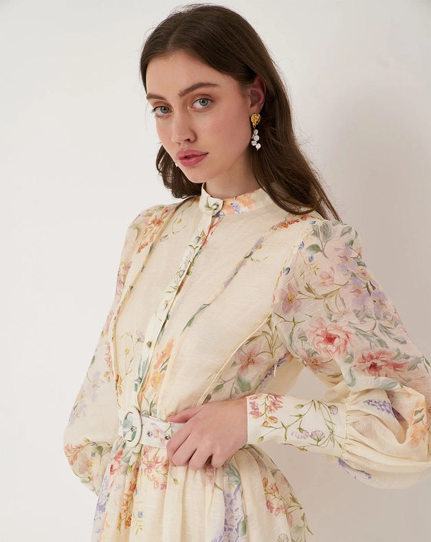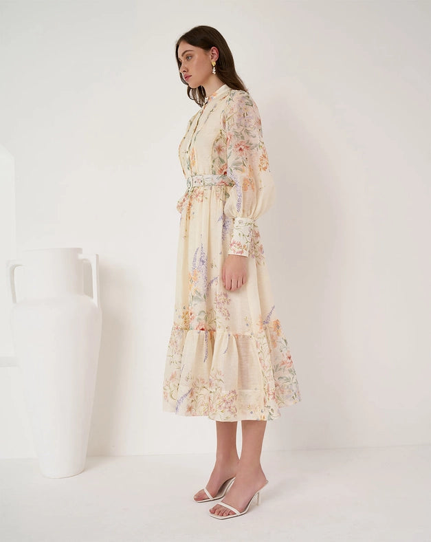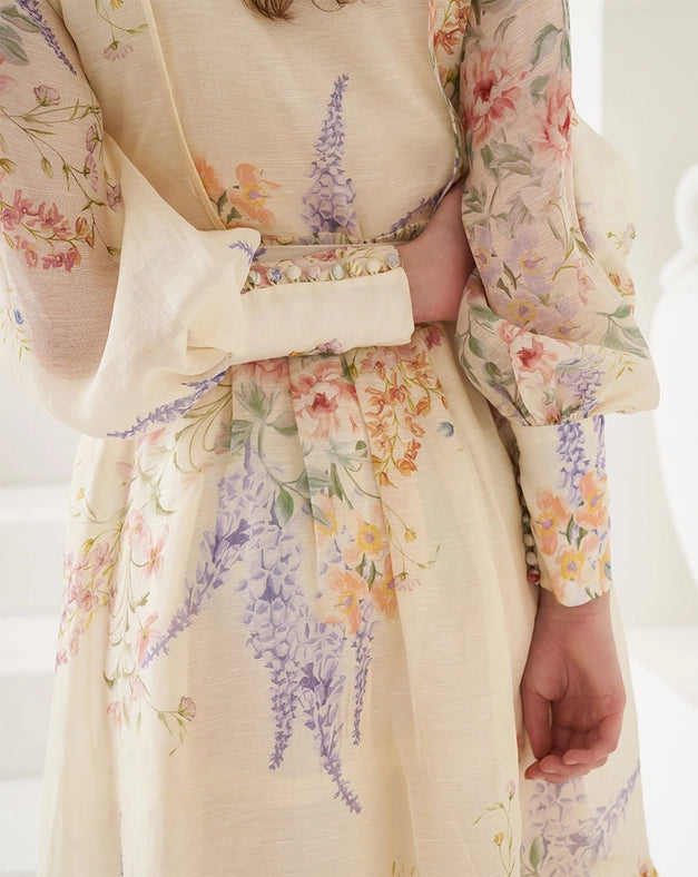 Expertly crafted in premium quality silk-linen fabrication, the Primrose Silk Collar Maxi Dress is the standout item of the season. With a flattering mandarin collar and wide full-length blouson sleeves, this dress exudes timeless elegance. The midi-maxi length, button through front, and separate belt offer versatility and a perfect fit. Lined and with a side zipper opening, this dress is as practical as it is stylish. Made with 45% silk and 55% linen for a luxurious feel.
