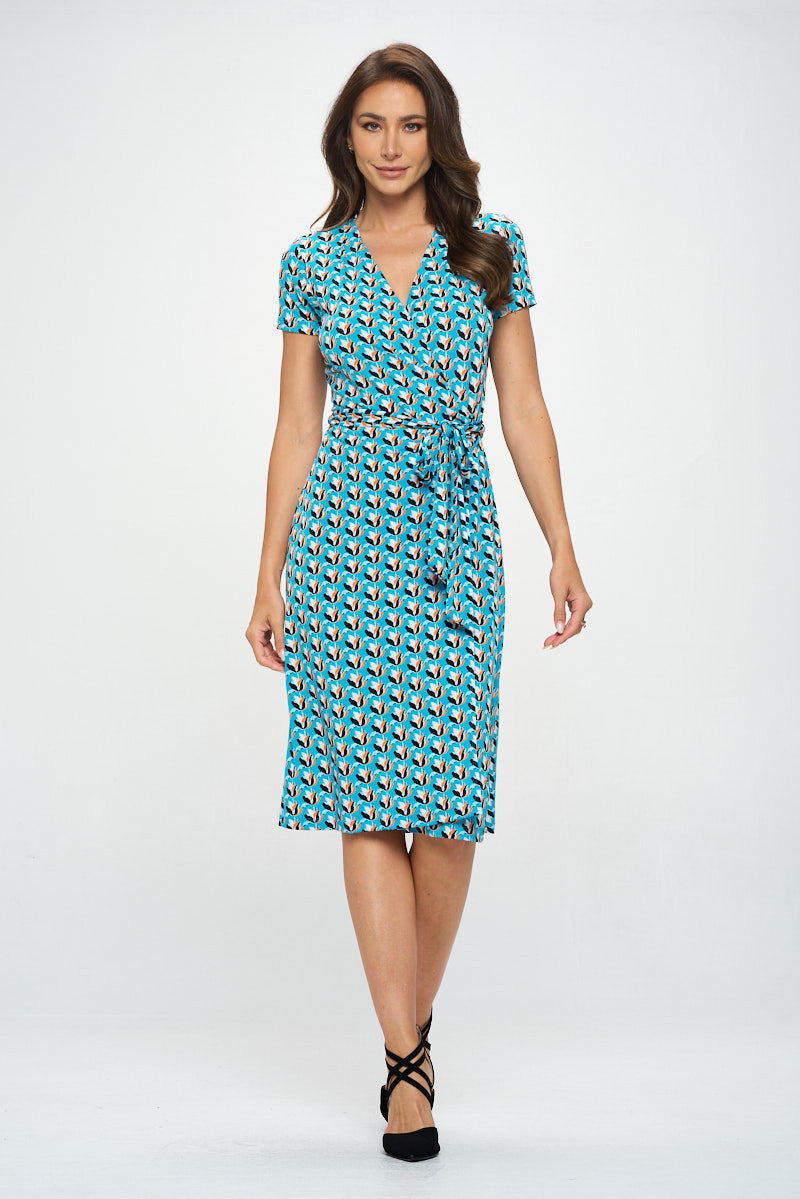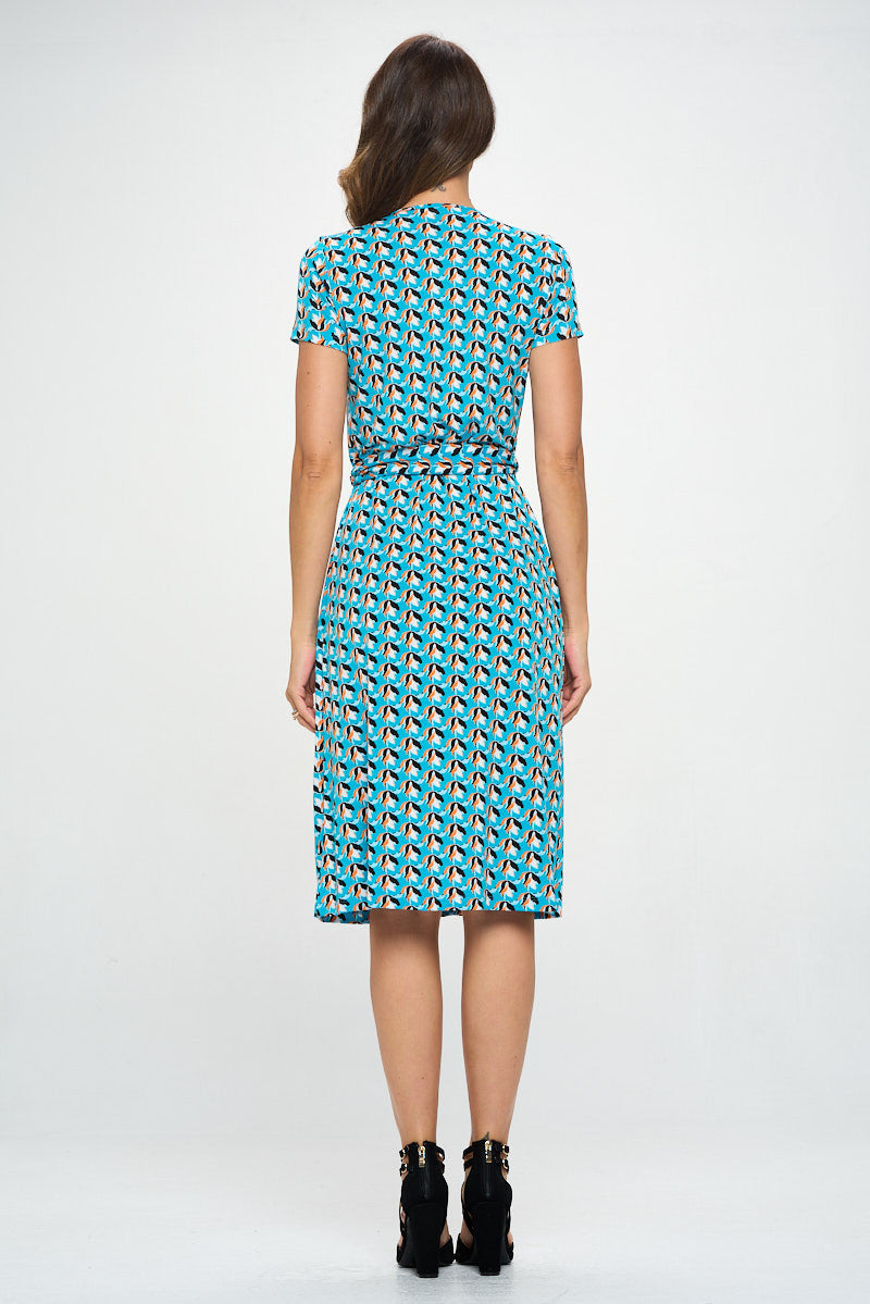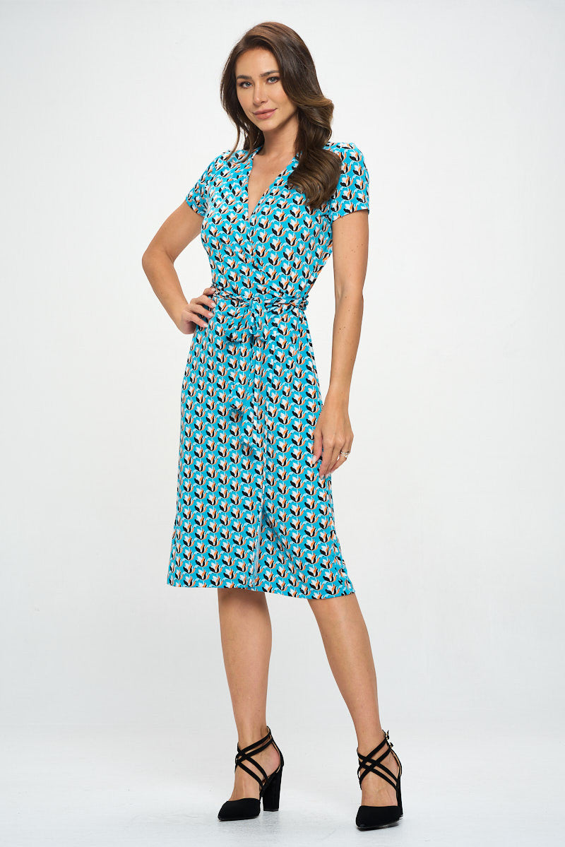 Print V Neck Jersey Dress With Tie-Dresses-Heer Decor-Small-TEAL-Urbanheer