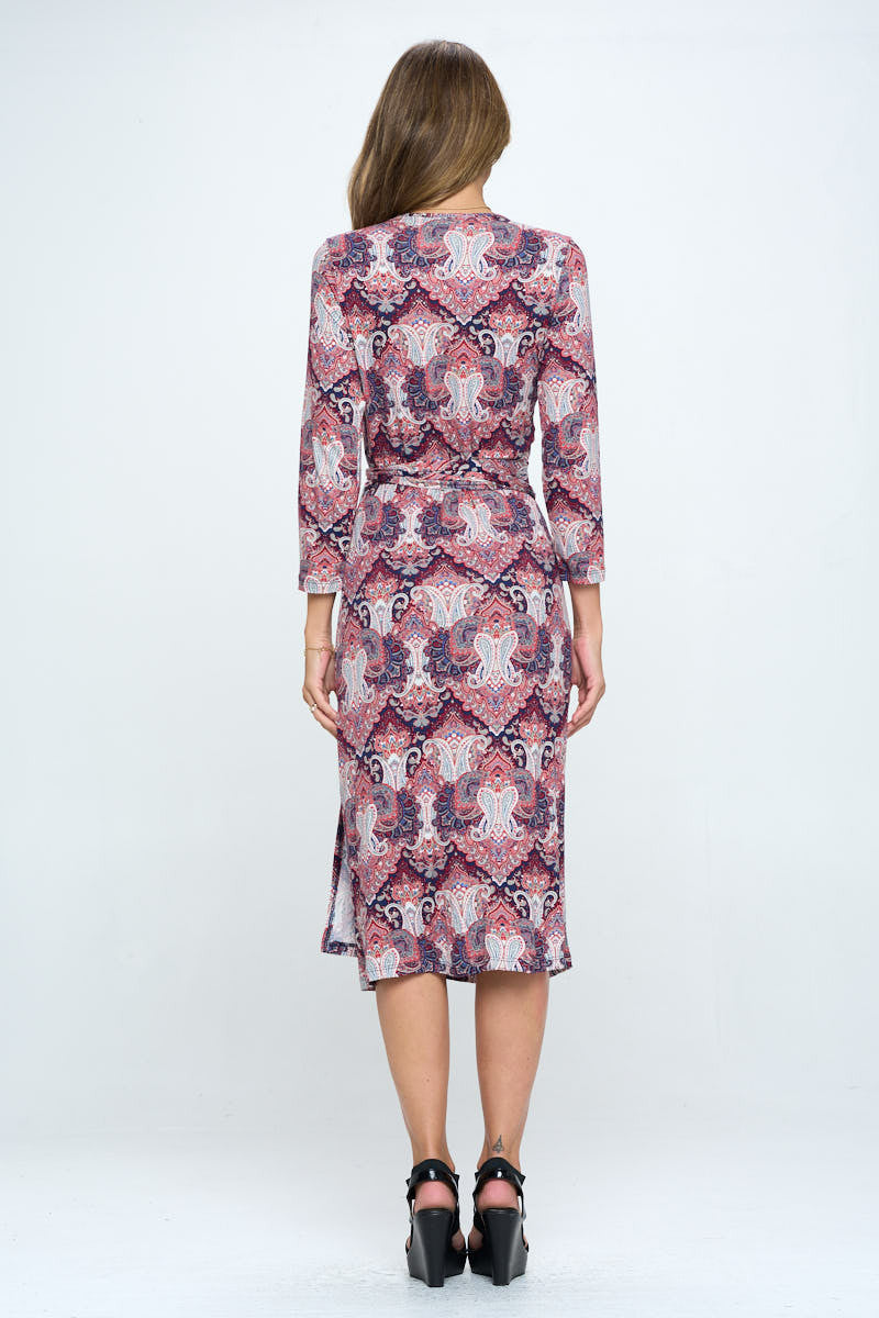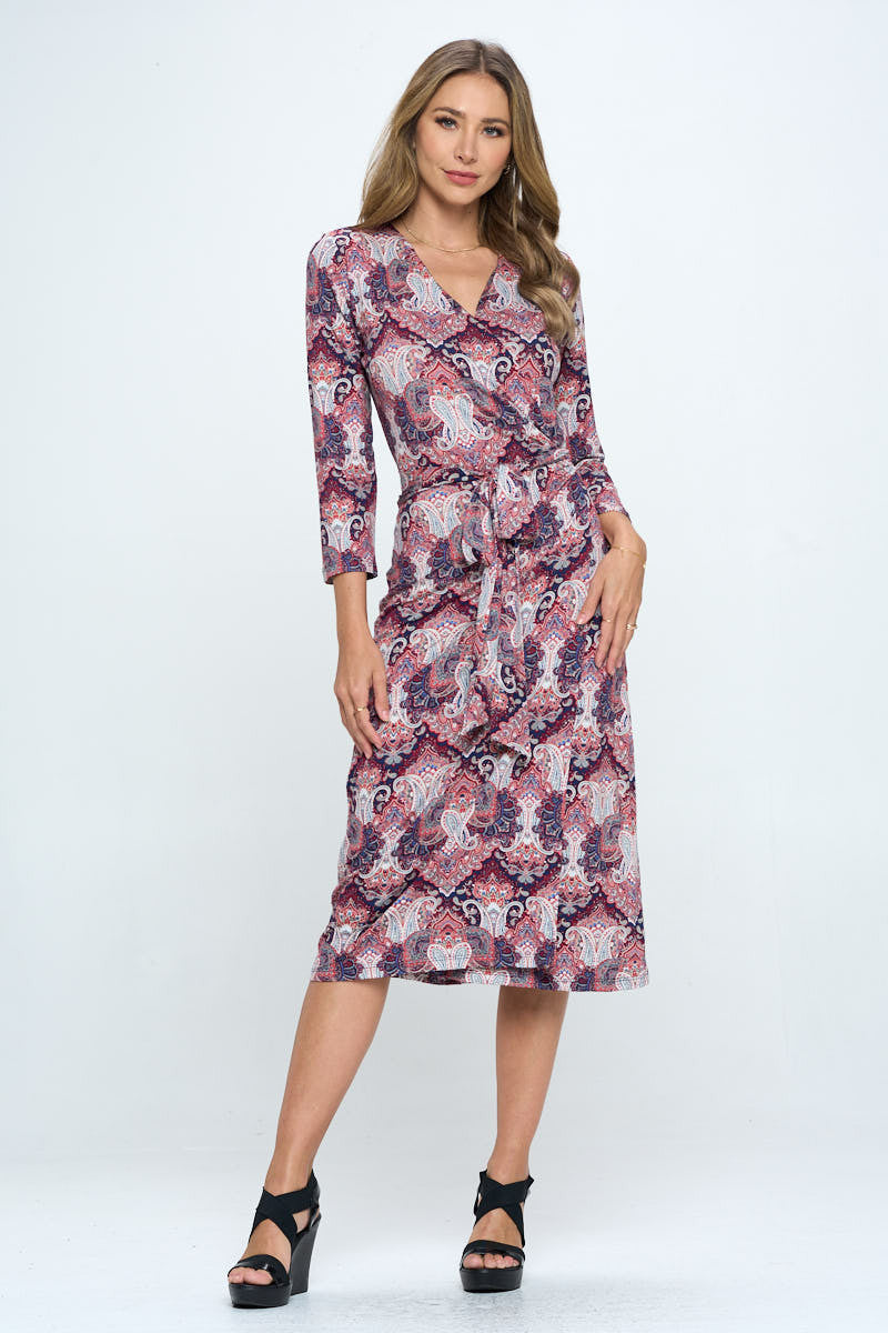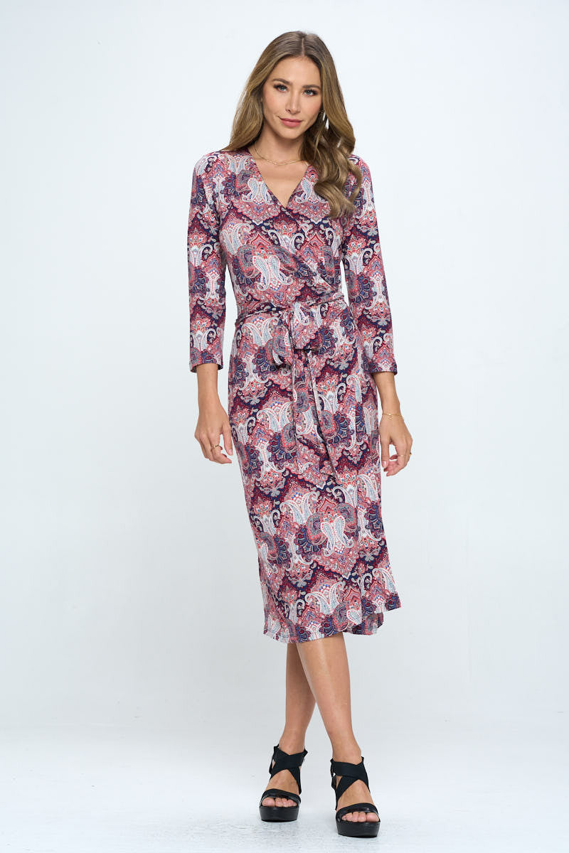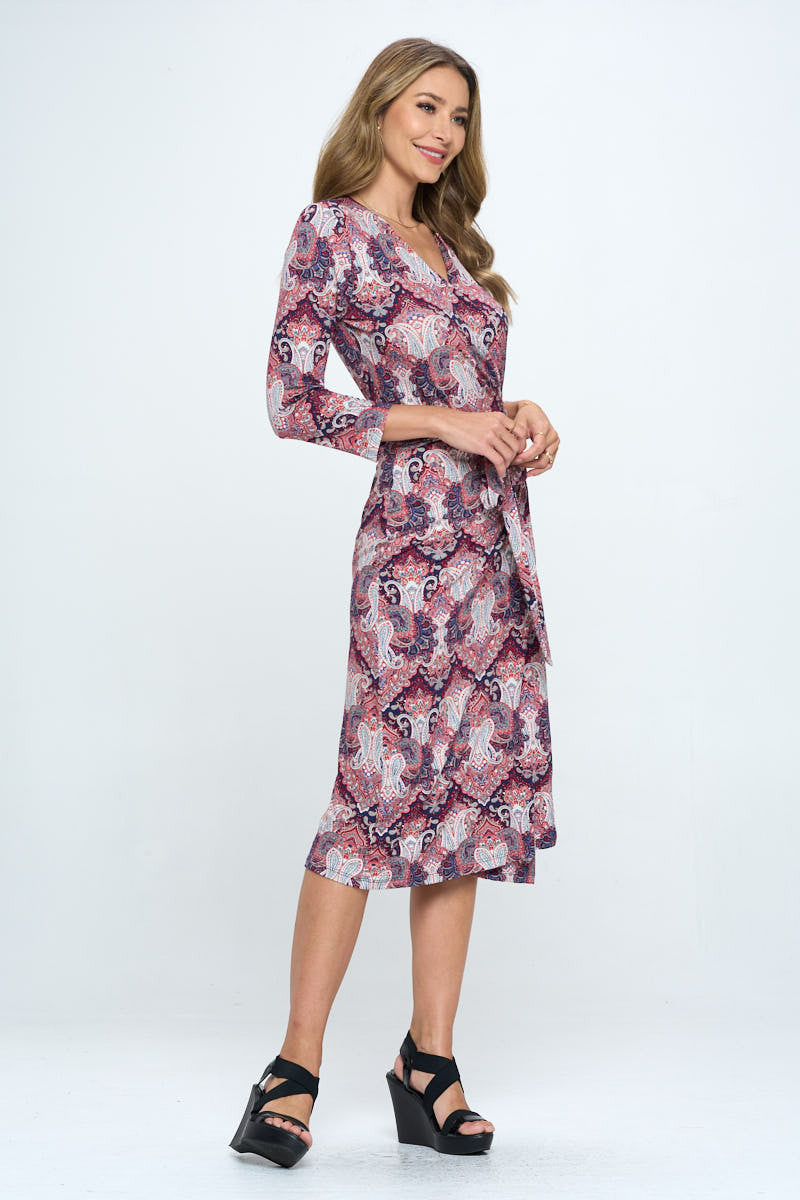 Made in USA Print V neck Jersey Wrap Dress with Tie. Fabric content: 95% Rayon, 5% Spandex.