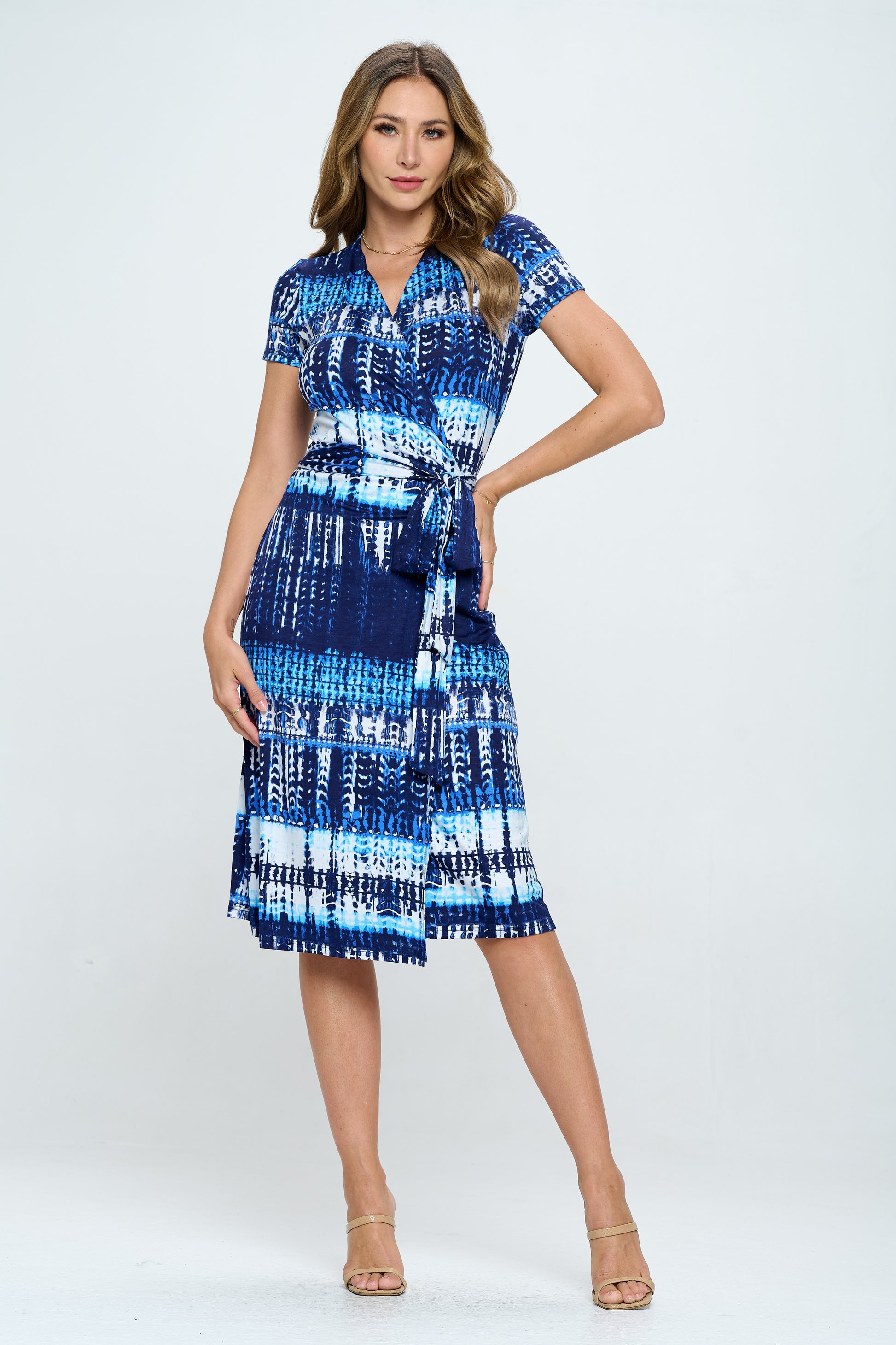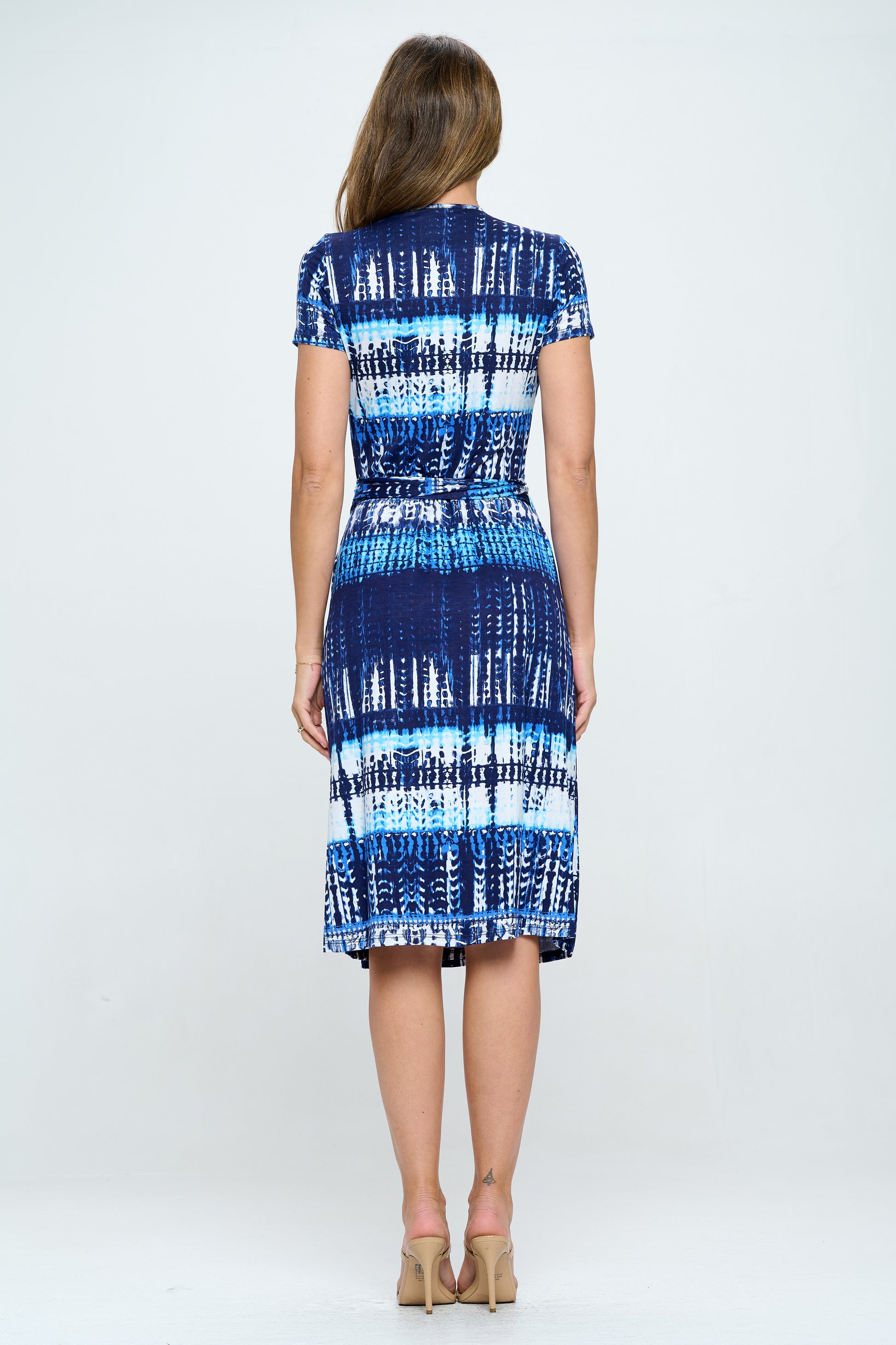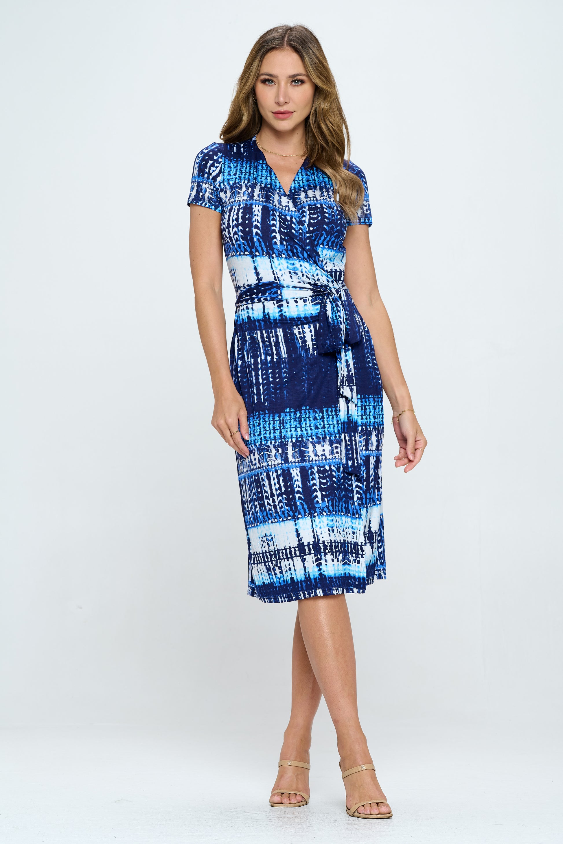 Made in USA Print V neck Jersey Wrap Dress with Tie. Fabric content: 95% Rayon, 5% Spandex.