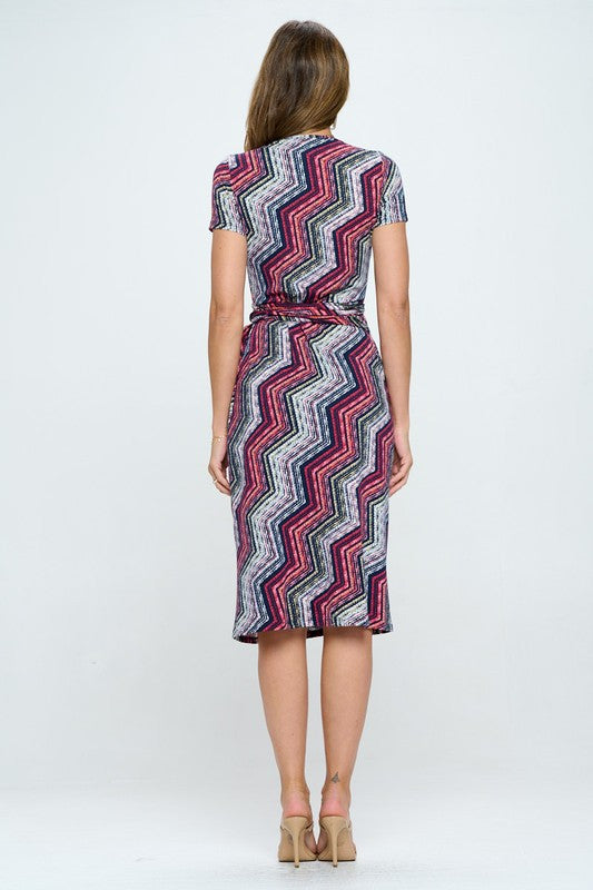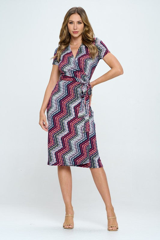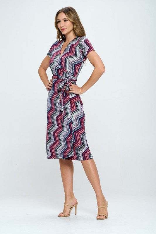 Made in USA Print V neck Jersey Wrap Dress with Tie. Fabric content: 95% Rayon, 5% Spandex.
