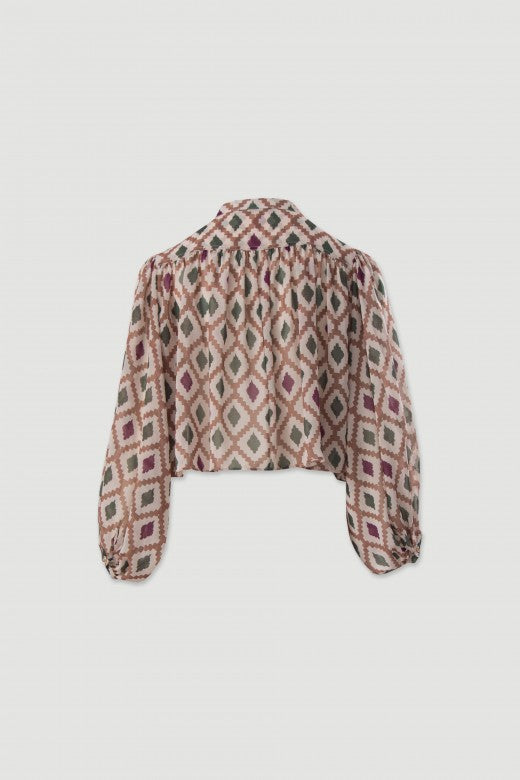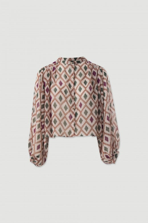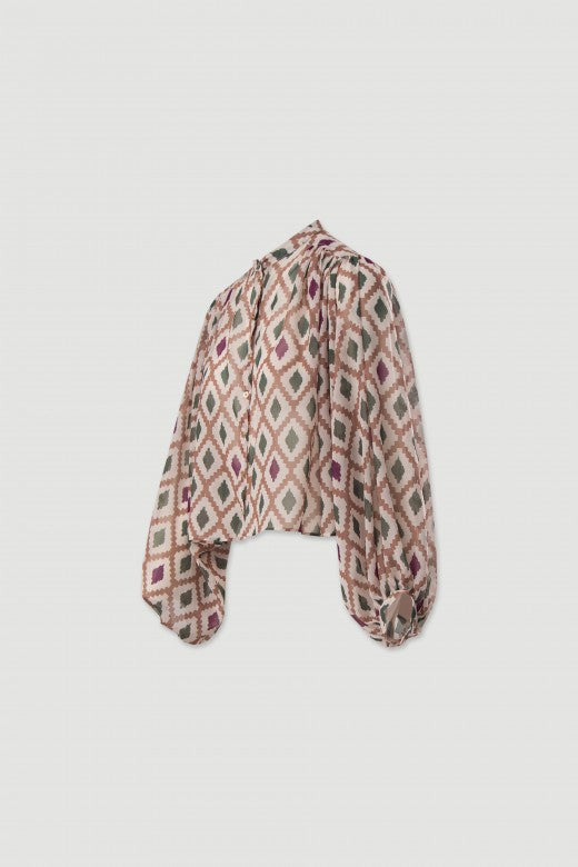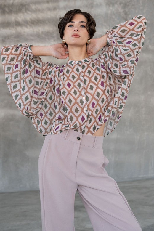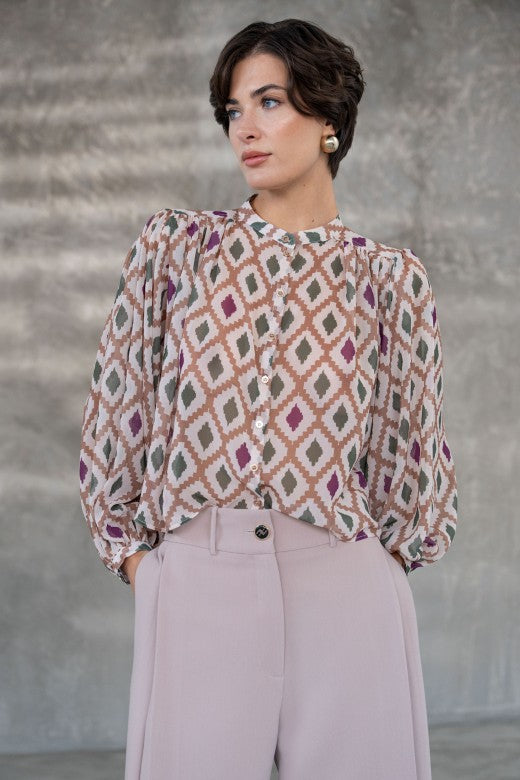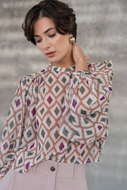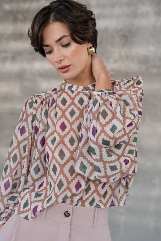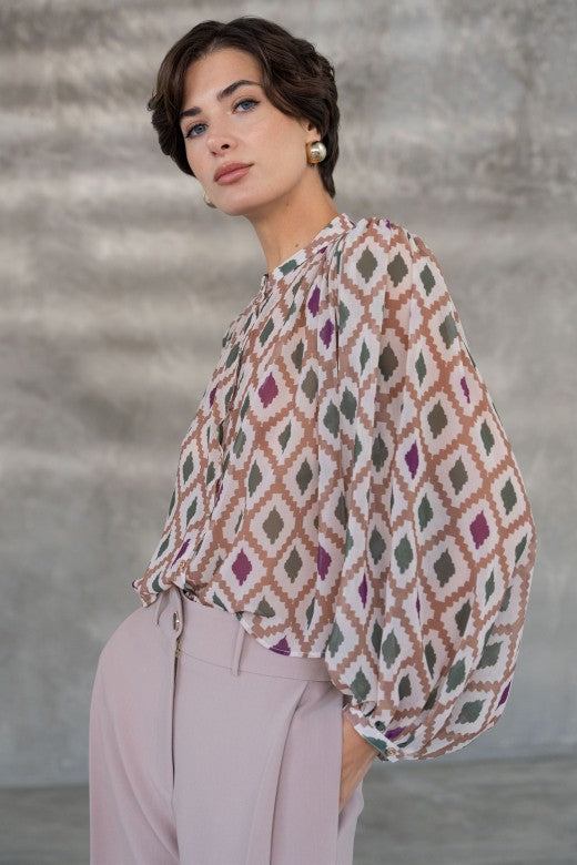 This elegant Printed Blouse with Balloon Sleeves adds a touch of sophistication to any outfit. The high collar and gathered effect at the front and back create a flattering silhouette. Balloon sleeves with cuff finish add a stylish statement. Made in Portugal with 100% polyester, this blouse is both comfortable and chic. Available in S, M, and L, with armhole measurements ranging from 75cm to 79cm.