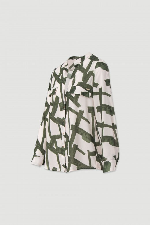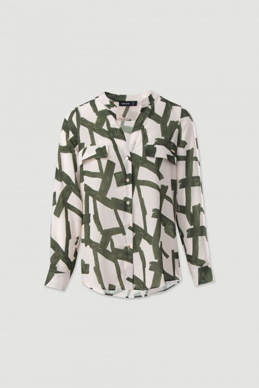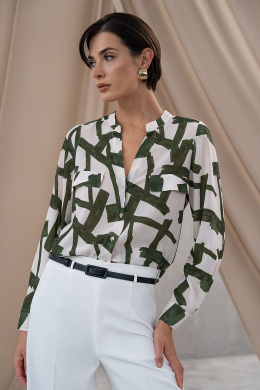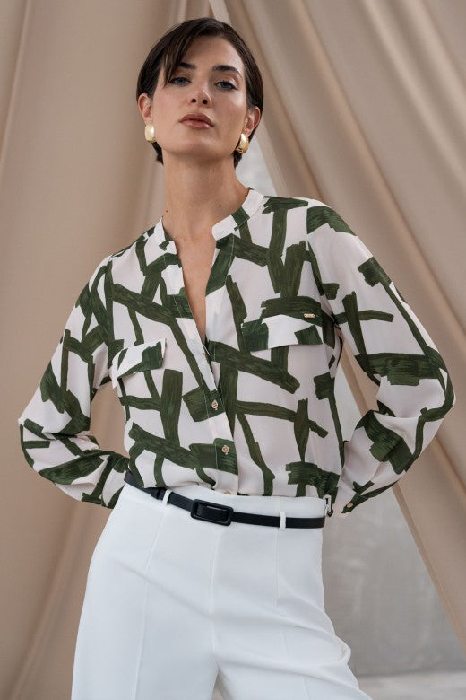 Expertly made in Portugal, this Printed Blouse boasts a high collar and V-neckline for a sophisticated touch. The long sleeves and front fastening add practicality, while the patches at the front add unique detailing. Made from 100% polyester, it's both comfortable and stylish. Available in sizes S-XXL.
