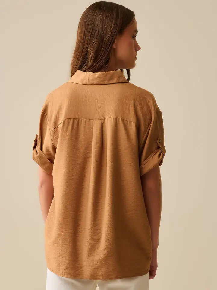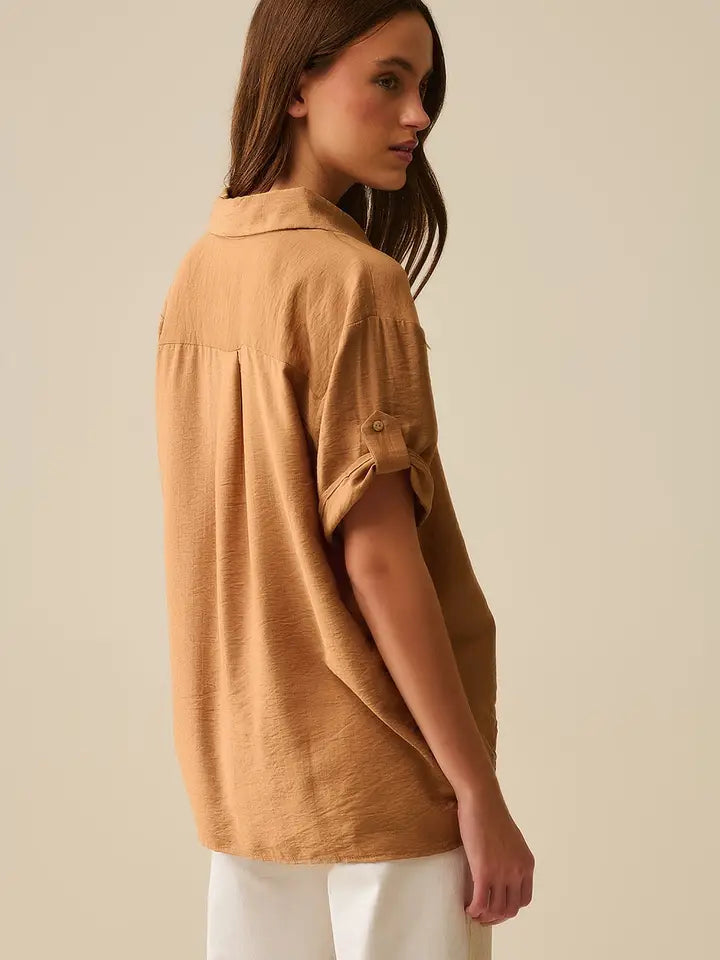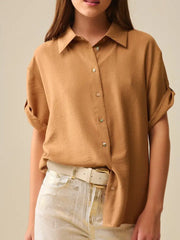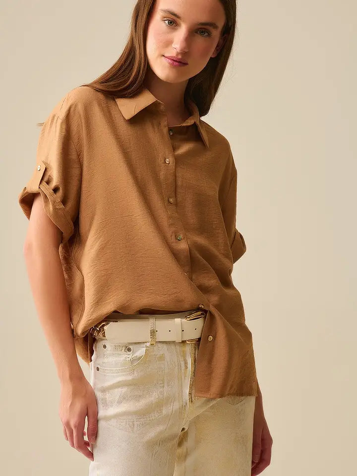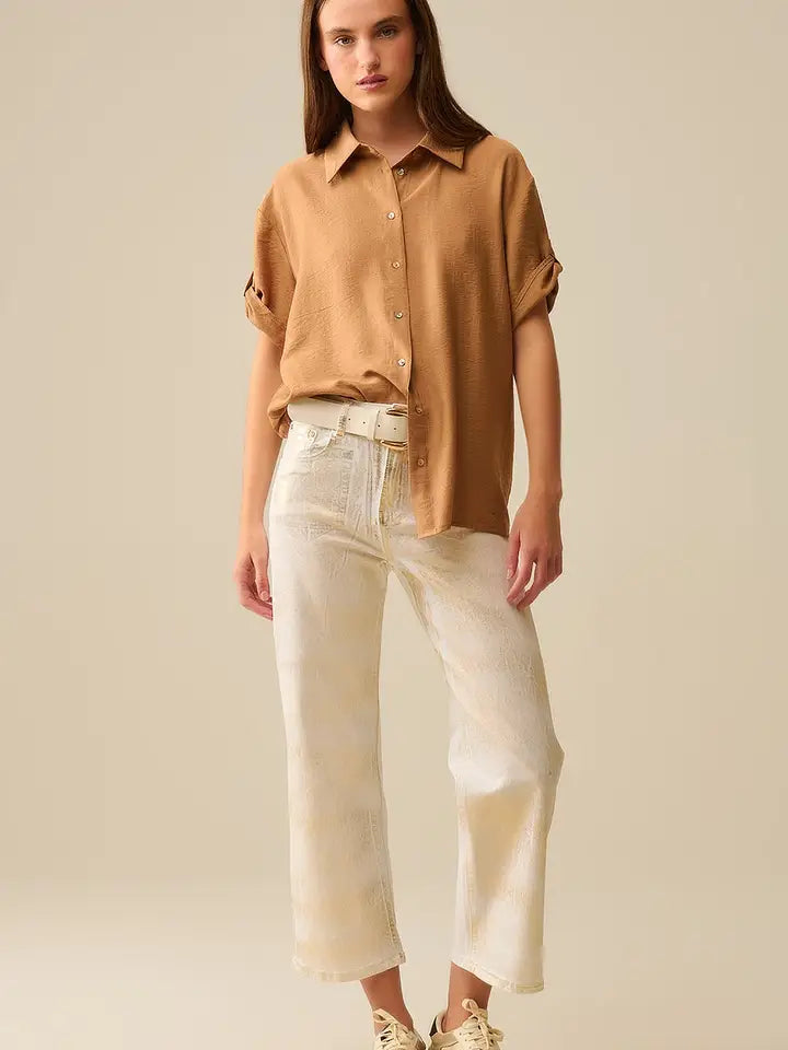Relaxed Camel Short Sleeve Shirt with Gold Buttons