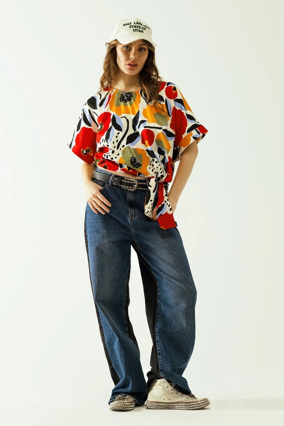 Relaxed White Blouse with Poppies Designs and Short Sleeves